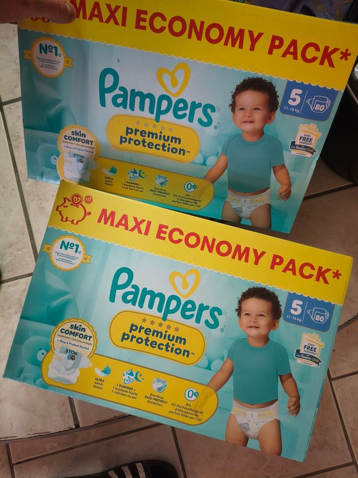 Lot de 2 maxi economy pack Pampers premium protection taille 5 neufs jamais déballés , vendu plus de 70€ en magasin