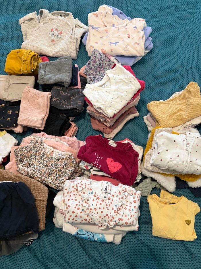 . 8 pulls chauds • 17 pulls légers • 6 gilets • 8 robes • 5 bodies taille naissance • 10 bodies taille 1 mois • 6 bodies taille 0mois • 22 pantalons et leggings • 4 pyjamas chauds • 1 t-shirt à manches courtes. Toutes marques confondues : orchestra, gemo , Disney, Kiabi , tape à l’œil, ect….
