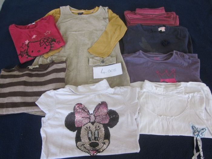 4 ans, robe velours + 5 hauts ml + offerts : robe ml tricot + 2 hauts ml (tâche), tao, dpam, in extenso, kiabi