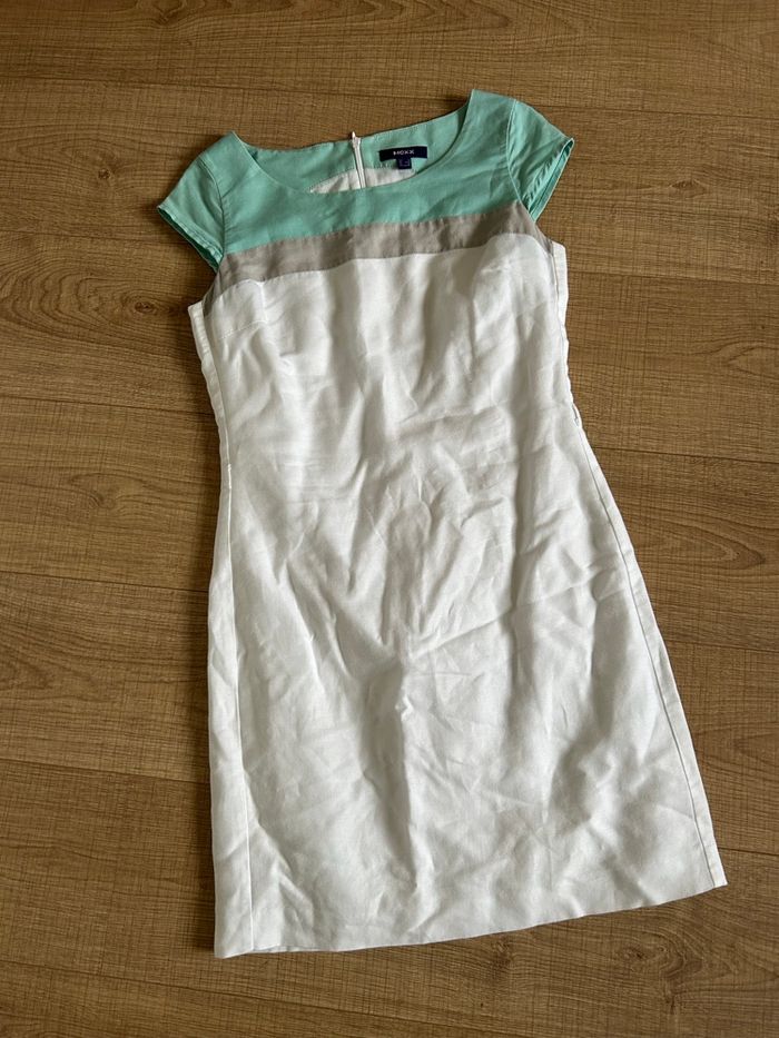 Jolie robe blanche et turquoise à manches longues, de marque Mexx. Fermeture dans le dos. Possibilité de mettre une petite ceinture, il y a des passants sur la robe. Taille française 38/40, mais qui correspond davantage à une taille 38 (voir mesures en dessous). Portée plusieurs fois, en bon état. aisselle à aisselle 45 cms épaule à épaule 37 cms taille 38 cms longueur depuis épaule 87 cms Étiquette intérieure de composition coupée