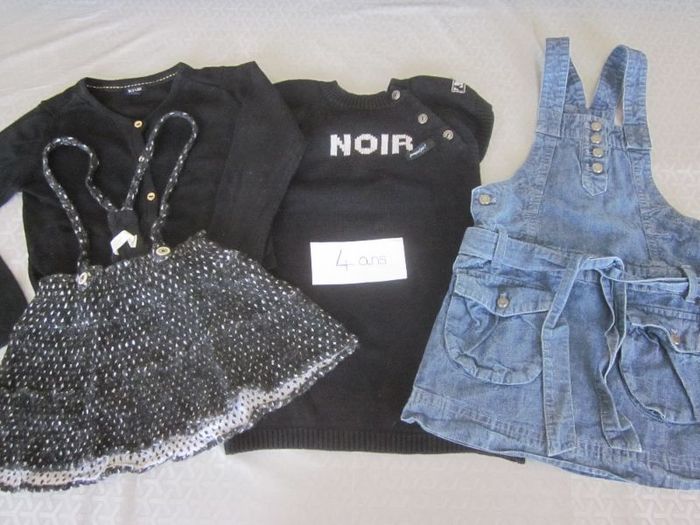 4 ans, jupe salopette (les attaches de derrière sont un peu effilochées) + robe mc tricot + jupe bretelles + gilet, vert baudet, zara, kiabi