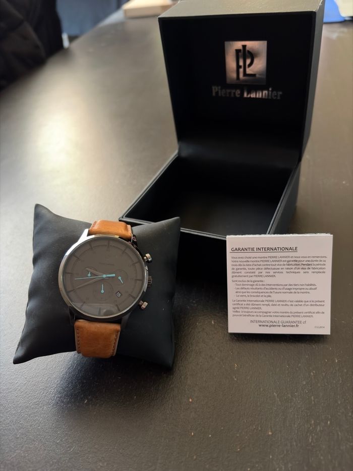 Vends montre Pierre Lannier Dune en cuir. Aiguille turquoise. Bon état,pile neuve. Une petite trace sur le verre,pas gênante et polissable.
