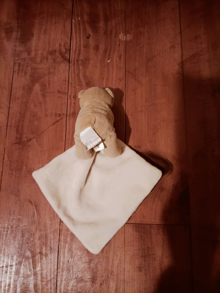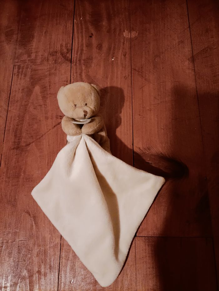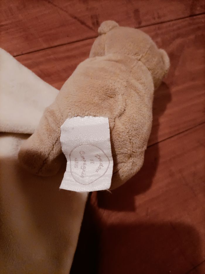 Ourson marron tenant un mouchoir entre ses mains. De doudou&compagnie.