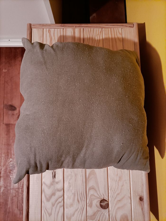 Coussin gris/blanc, dimensiuons: 40 X 40 cm au motif du chat. Jamais utilisé, quelques bouloches dûes au lavage.