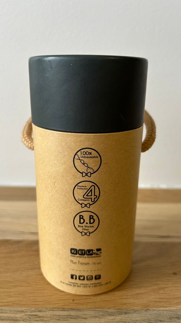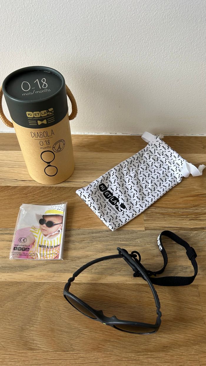 Lunettes de soleil bébé Diabola Noir Ki ET LA Lunettes de soleil Diabola Marque Ki ET LA Catégorie 4 De 0 à 18mois Dans sa boîte et étui, avec son attache. DIABOLA, le modèle emblématique de lunettes de soleil bébé Ki Et La conçu pour accompagner bébé, de ses premiers rayons de soleil jusqu'à ses premiers pas grâce à son système 2 tailles en 1. Légères, incassables et pleines de style, ces lunettes de soleil sont l'accessoire incontournable pour protéger les yeux sensibles des jeunes aventuriers en herbe. Ce modèle est idéal pour l’acquisition d’une première paire de lunettes de soleil bébé ! Chaque paire de lunettes DIABOLA, designée en France, révèle une attention particulière portée au confort et à la sécurité des bébés, qu’ils soient filles ou garçons. Incassable et légère, cette monture évolutive propose un système unique et déposé “2 tailles en 1” et s’adapte ainsi avec l’arête nasale du bébé. Ainsi, les bébés pourront les porter, dès leur plus jeune âge, en position « 1 » entre 0 et 6 mois sur un petit nez très peu formé. Puis, il suffit de les retourner pour les mettre en position « 2 » de 6 à 12 mois. Les lunettes DIABOLA sont synonymes de robustesse et de sécurité : - Monture injectée en une seule pièce (TPEE) : INCASSABLE parfaitement adaptée à la manipulation des bébés. - Pas de charnière : aucun risque de se pincer ni d’avaler de petites pièces métalliques. La santé des yeux des bébés est primordiale. Les verres en polycarbonate catégorie 3 garantissent une protection maximale aux yeux de bébé. Les verres filtrent 100% des UV (Anti-UVA, Anti-UVB, Anti-UVC.) et sont d’une hauteur de 3,2 cm afin de protéger parfaitement l’œil de l’enfant ! Il y a un filtre anti-lumière bleue pour diminuer l’éblouissement. Le confort : - Des branches très courtes adaptées à la position allongée des bébés. - Des branches très fines pour ne pas créer de pression sur les tempes et ni sur l'arête nasale. - Une entrée de nez spécifiques pour la morphologie des plus petits