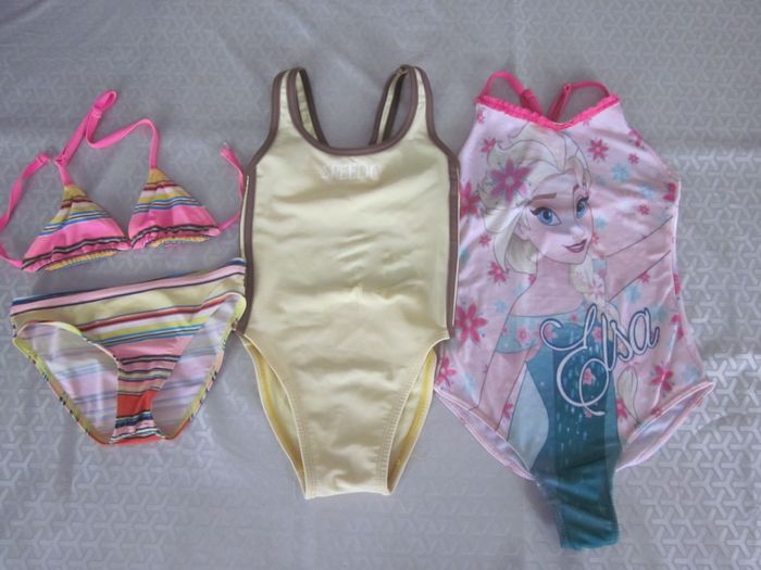 6 ans, 2 maillots de bain + 3ème offert (le jaune du milieu), disney, firefly