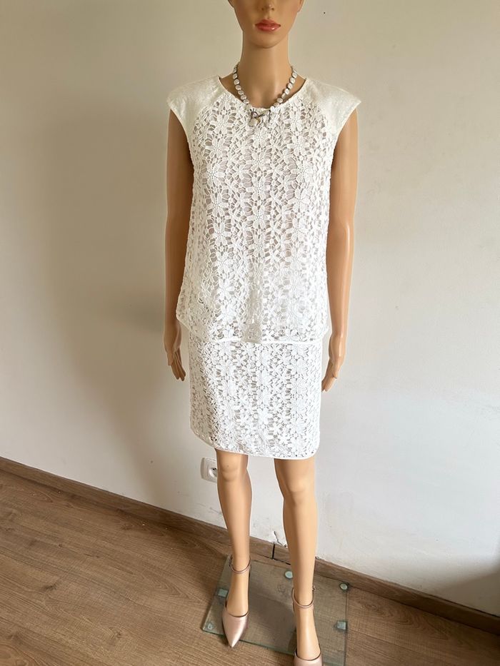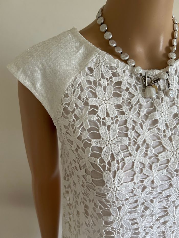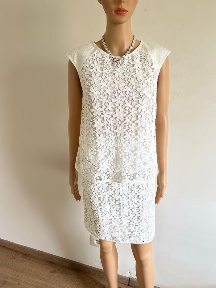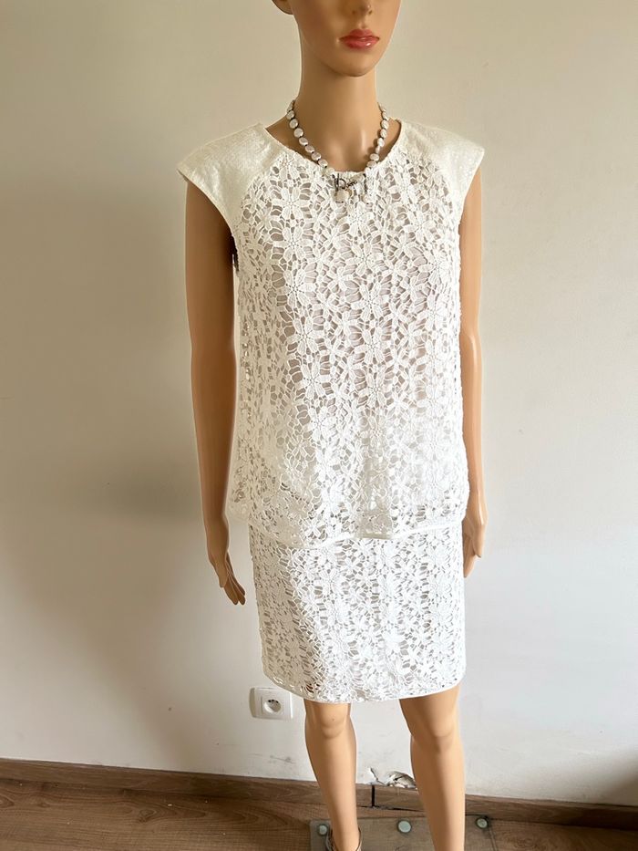 Magnifique ensemble blanc en dentelle, de marque Sud Express Composé d’une jupe en taille 38, et d’un haut sans manches en taille M. Peu porté, en très bon état. Dimensions à plat de la jupe taille 38 cms longueur 51 cms Dimensions à plat du haut aisselle à aisselle 46 cms taille 47 cms longueur depuis épaule 58 cms L’ensemble est composé à 100% de coton.