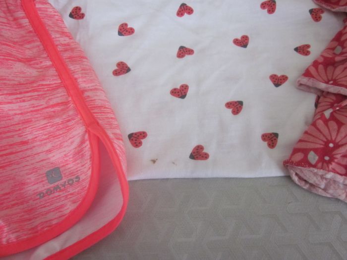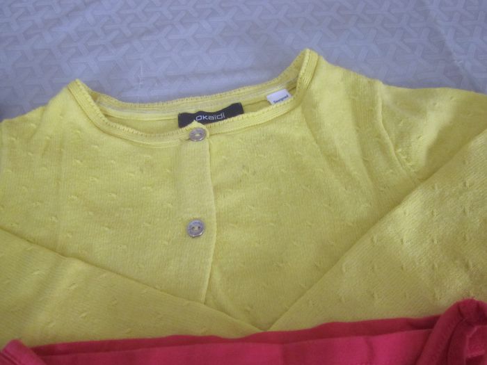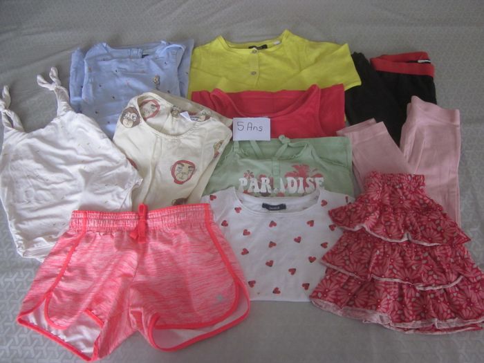 5 ans, 2 leggings + jupe + gilet + 3 hauts été + short (neuf) + maillot 1 pièce (réversible) + 2 robe été offertes, domyos, okaidi, kiabi, tao