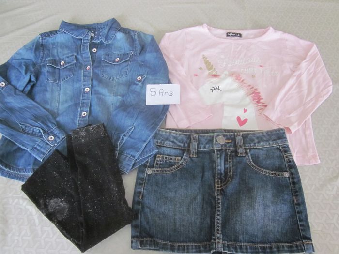 5 ans, haut ml + chemise jean ml (transformables en 3/4) + jupe + collants pailletés, okai, united color of benetton