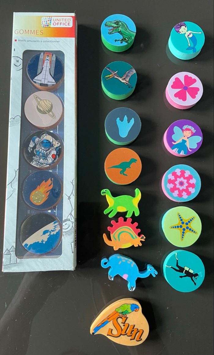 Vends en lots - Velleda + brosse neuve (4€) - cartouches encre bleues courtes (2€) - gommes: - dinosaure - univers- fleurs sirène et fée (1€)