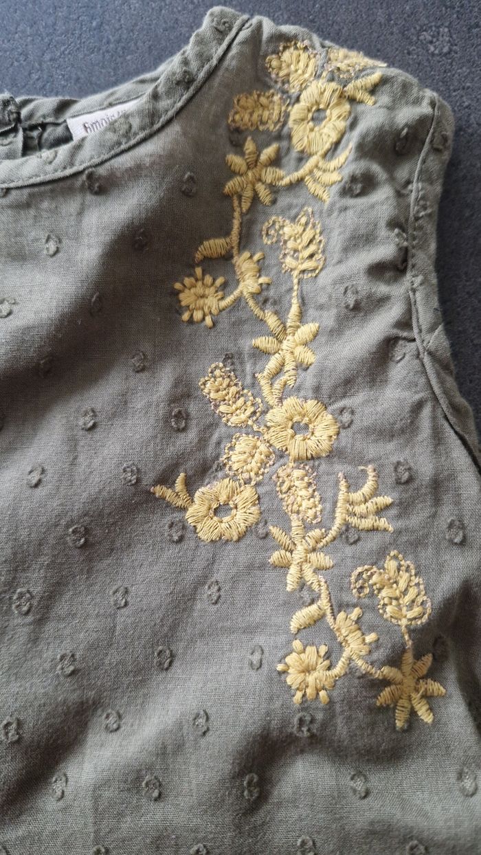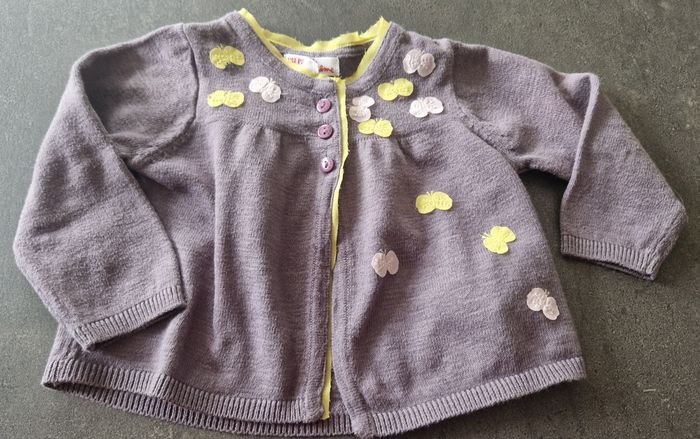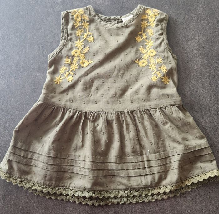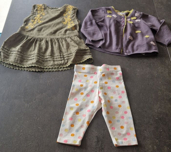 Robe kaki " boîte à malice" Gilet "dpam" Legging a pois "Primark " Taille 6 mois En très bon état
