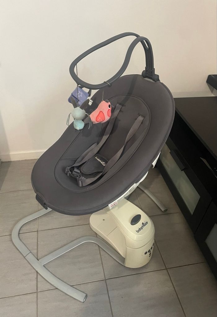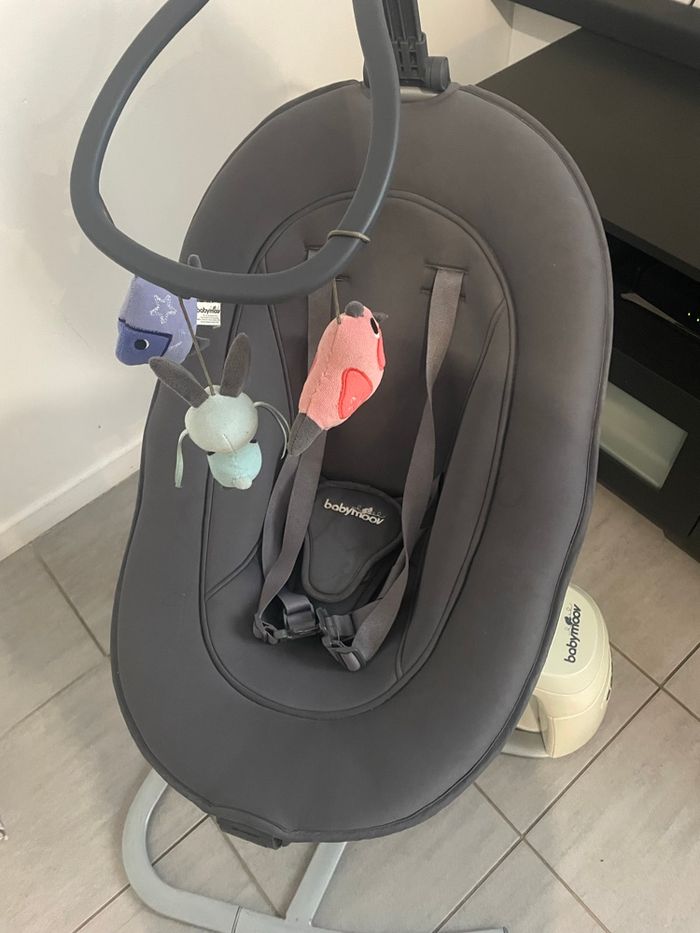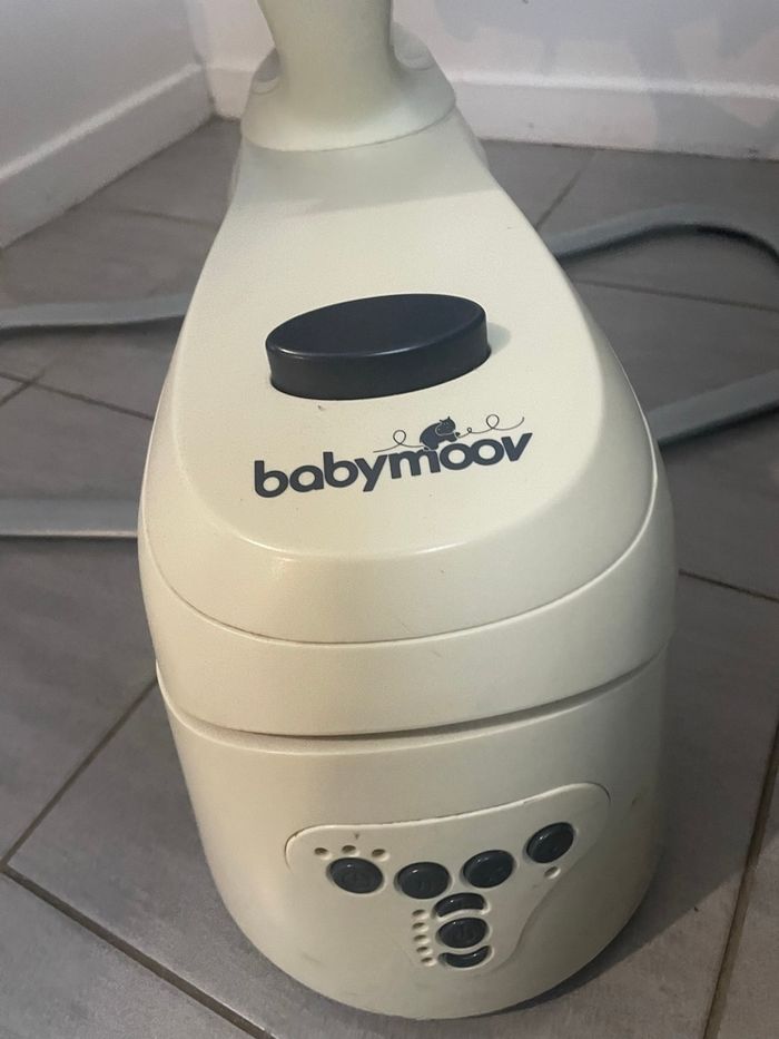 Balancelle BabyMoov – A bien servie , mais toujours en bon état Balancelle confortable avec plusieurs vitesses et mélodies. 3 positions assise, semi assis et allongée Utilisable dès la naissance, harnais de sécurité. Fonctionne parfaitement avec pile ( je n’ai pas le chargeur ) Remise en main propre sur Lille et ses alentours