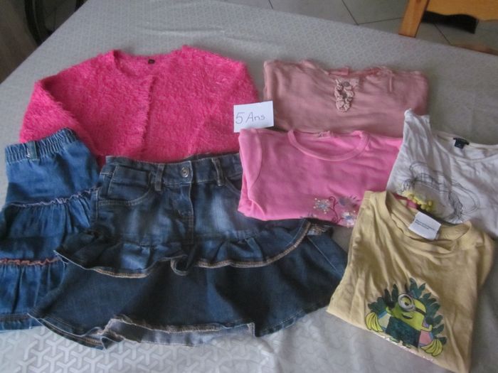 5 ans, 2 jupes jean + 2 hauts ml + offerts : 2 hauts + gilet , palomino, kiabi, minions, elvie girls