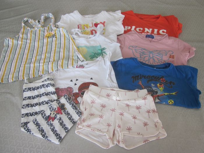 4 ans, short + legging + 2 hauts sans manche + 3ème offert (tâche) + 4 hauts mc, cie des petits, miraculous, kiabi, disney