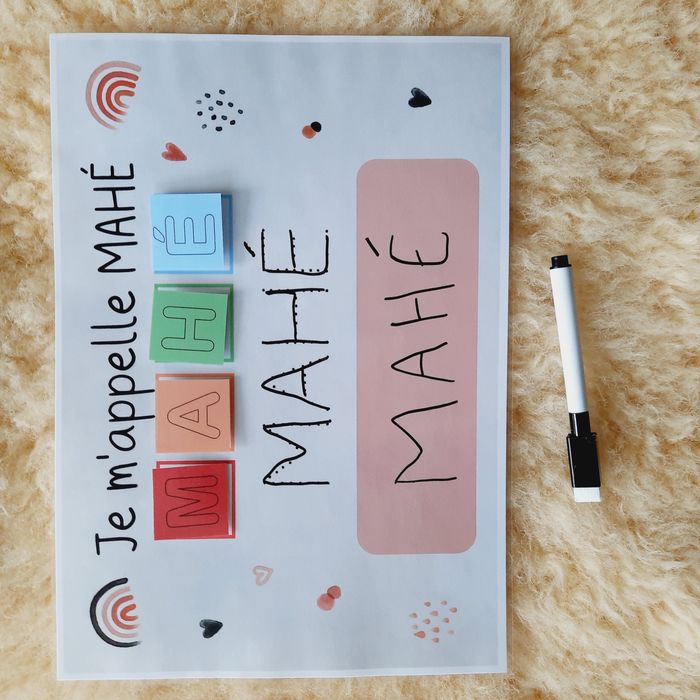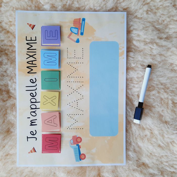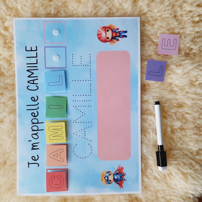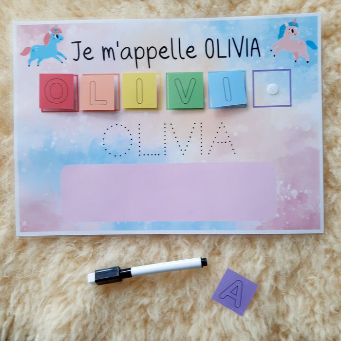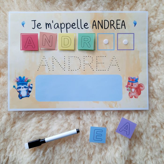 Ces supports pédagogiques permettent d’apprendre à l'enfant de façon ludique à reconnaître et à écrire son prénom. Dans un premier temps, il peut reconstituer son prénom avec les lettres scratchées, puis, tracer sur les pointillés, et enfin l’écrire tout seul ! Idéal pour la maternelle ♥ 1 support A4 plastifié (125 microns – effet brillant) et "scratché" ♥ Vignettes des lettres du prénom de l'enfant (environ3,5x3,5cm) ♥ Feutre non fourni ! ♥ Support réalisé sur commande, merci de me préciser au moment de l'achat le prénom de l'enfant et la version choisie ♥ Envoi postal dans une pochette à dos cartonné pour éviter tout désagrément durant le transport