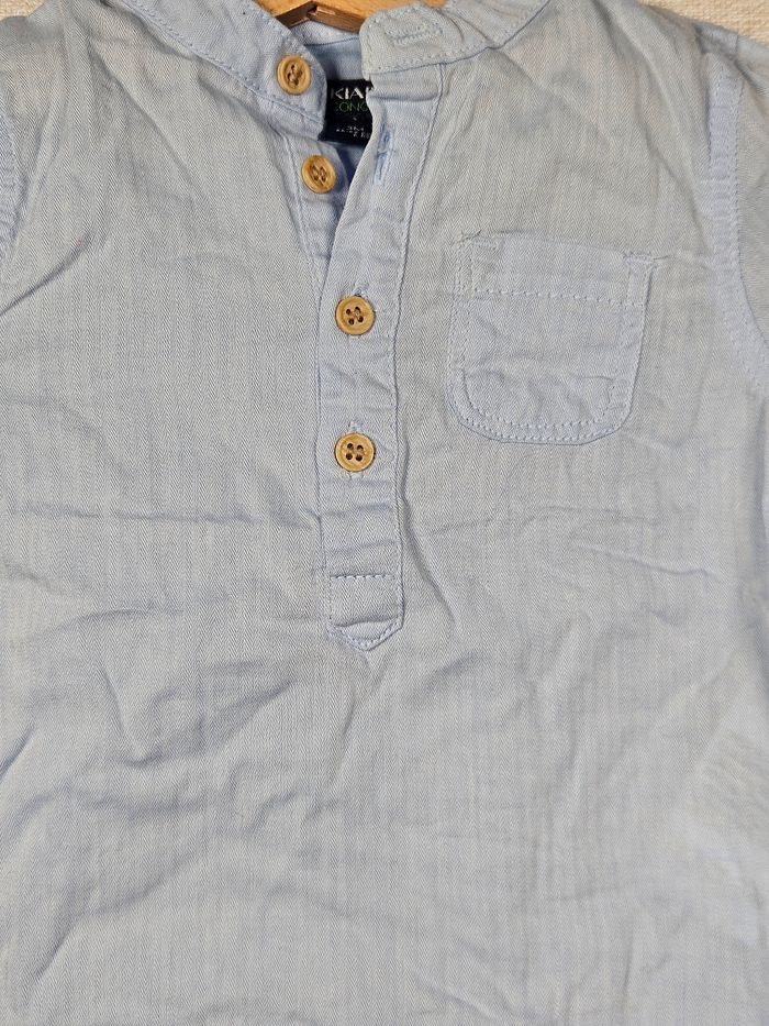 Hello ! 👋 Je te propose cette pièce de la marque Kiabi, une super trouvaille pour ton dressing ! pour le dressing de bébé 👶 Une jolie chemise légère au tissage chevrons, très pratique avec ses manches qui peuvent se porter longues ou retroussées. ​Informations utiles: ​👕 Article : Chemise col mao à manches retroussables ​📏 Taille : 3 mois (56-62 cm) ​🌈 Couleur : Bleu ciel ​🧵 Matière : 100% Coton ​✨ État : ⭐⭐⭐⭐ ​Les petits + : 🏡 Logement non fumeur et sans animaux. 📦 Envoi rapide et soigné. ​N'hésite pas si tu as la moindre question ou si tu veux d'autres photos ! Je suis là. 😉 ​#chemisebebe #kiabi #3mois #taille56 #taille62 #bleuciel #coton #garcon #printemps #tresbonetat