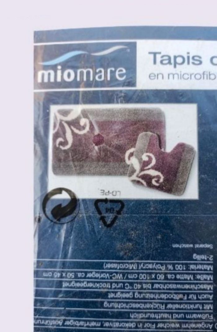 Lot de 2 tapis de salle de bains : ✓ Un tapis rectangulaire 60 X 100 cm ✓ Un tapis pour WC assorti 50 X 45 cm Marque Miomare ➡️ NEUFS ENCORE EMBALLÉS Fibres douces et agréable avec un modèle de décoratif Adapté au chauffage au sol Lavable en machine jusqu'à 40°C et adapté au sèche-linge Dessous avec revêtement fonctionnel