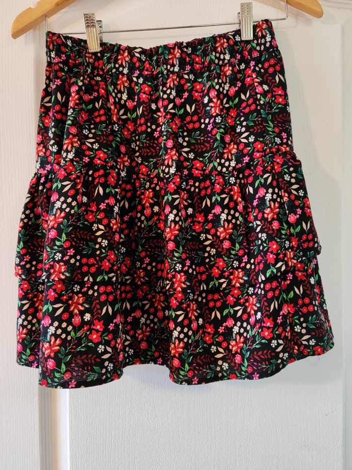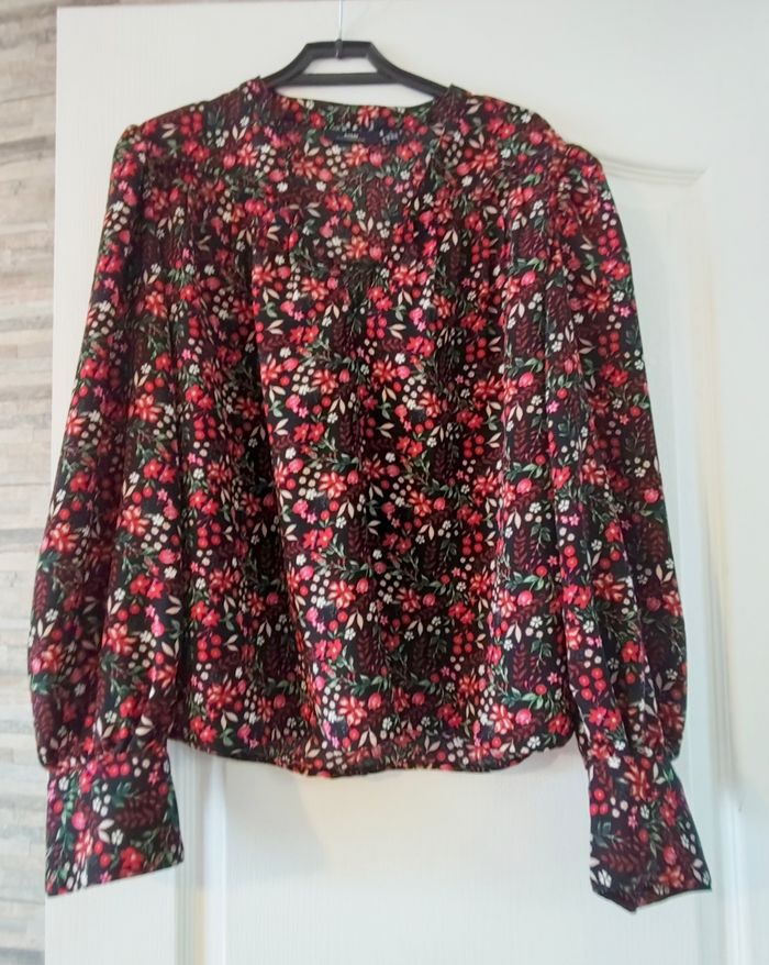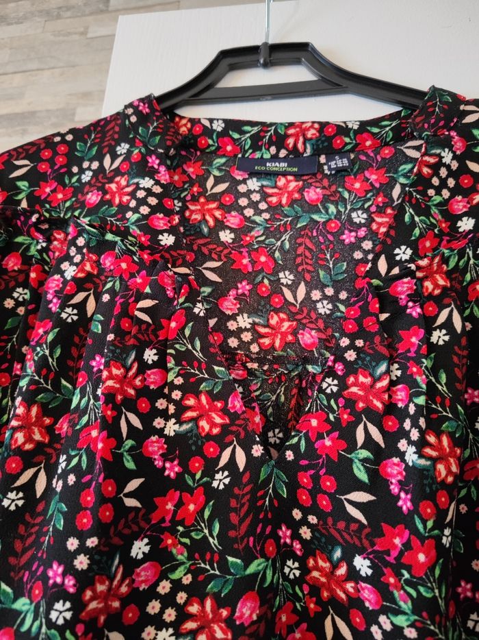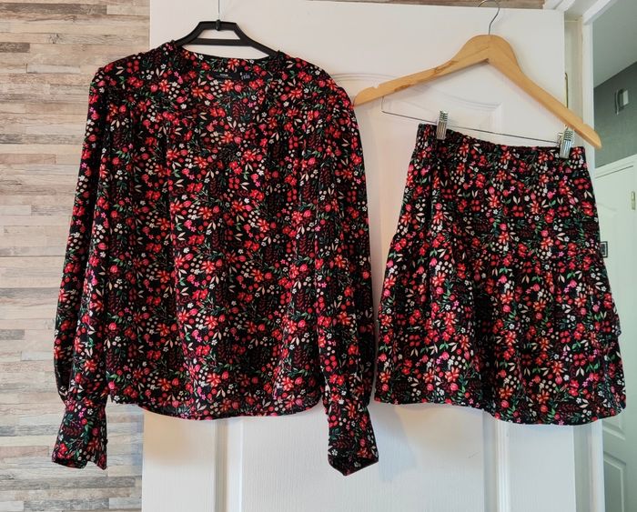 Je vends cet ensemble chemisier et jupe à volants de la marque Kiabi, en taille 36. Imprimé floral multicolore Très bon état