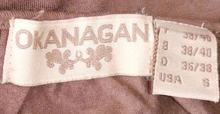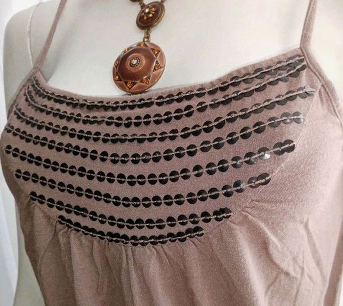 débardeur marron de la marque Okanagan taille 38 / 40 avec des paillettes sequins sur l'encolure 3 boutons décoratifs dorés dans le bas du côté gauche 95% viscose - 5% elasthanne largeur sous emmanchures 43 longueur 58