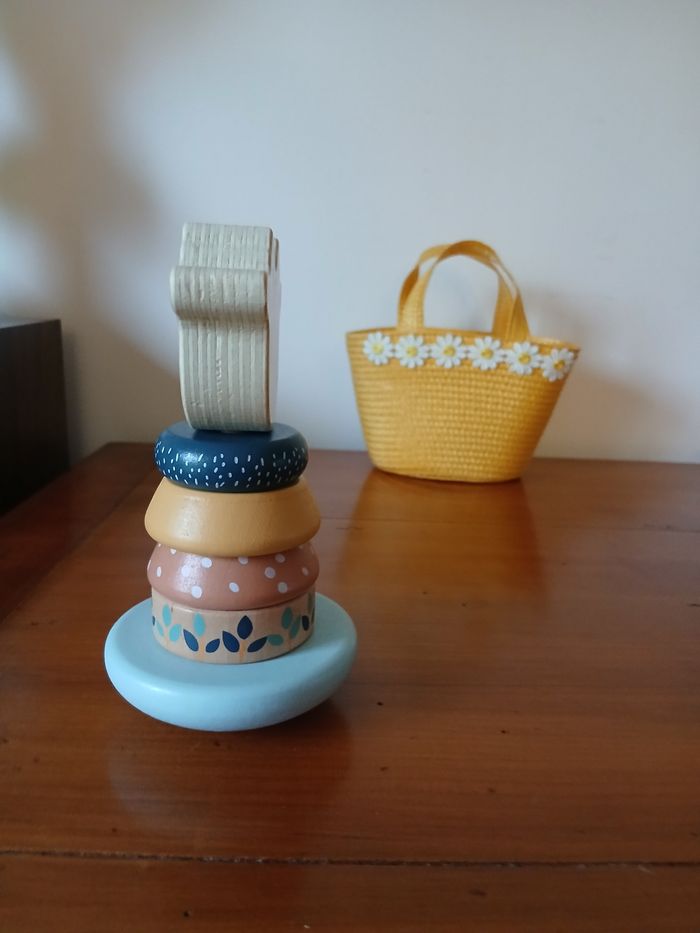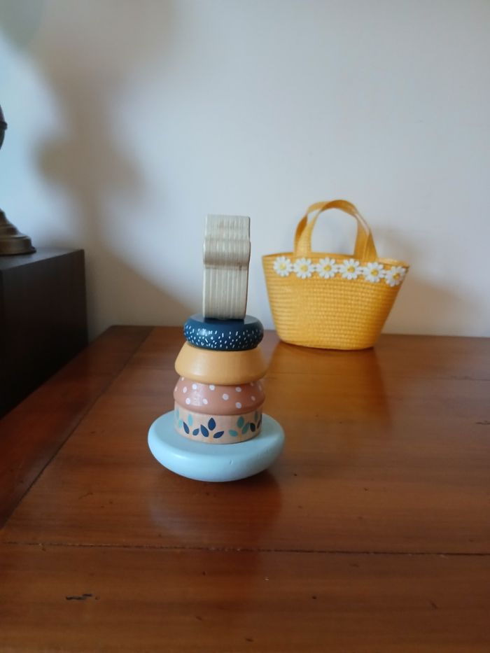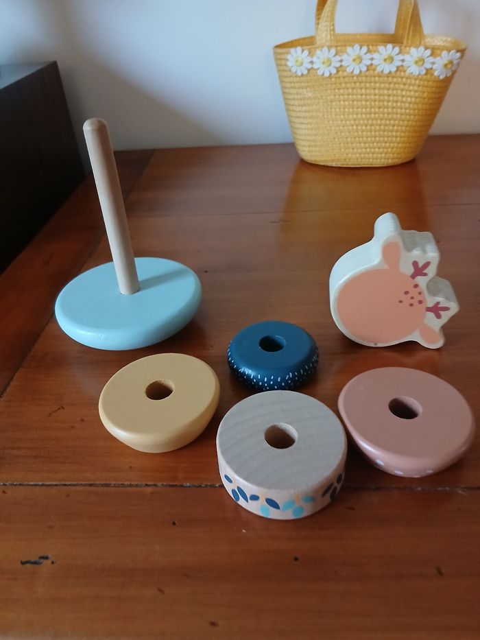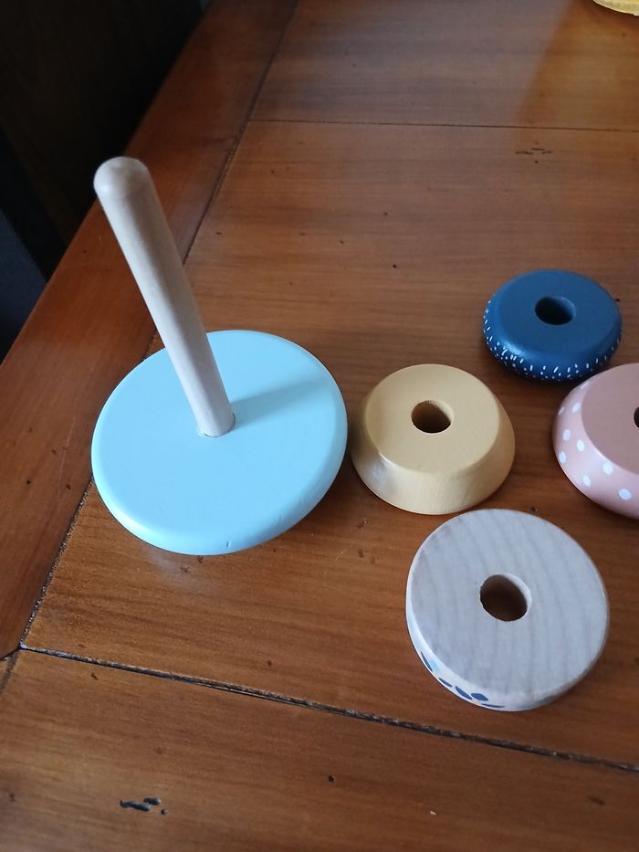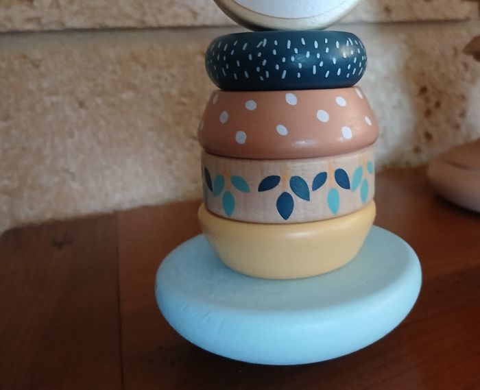 Jouet en bois massif peint; motricité fine. Formes à empiler avec mouvement de culbuto. Hauteur totale de 14 cm // voir photos pour détails