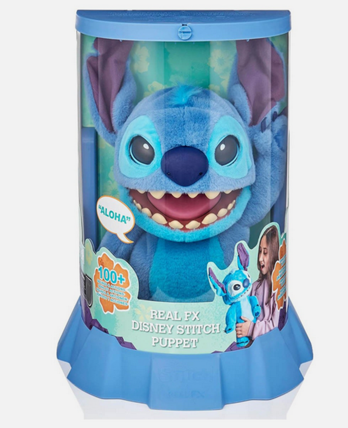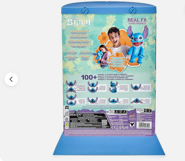 Peluche interactive stitch Marionette intéractive réagissant au toucher Avec plus de 100 combinaisons de sons et de mouvements, ce Stitch a une attitude qui le rend vivant Capteurs sensibles au toucher sur la tête, la bouche et le nez Stitch est livré dans une capsule extraterrestre, idéale pour l'exposer Contenu : 1x peluche Disney Stitch Real FX, 1x capsule extraterrestre Dimensions de la peluche : 20,3L x 22,9l x 45,7H cm Piles requises : 3x LR03 AAA (non fournies)