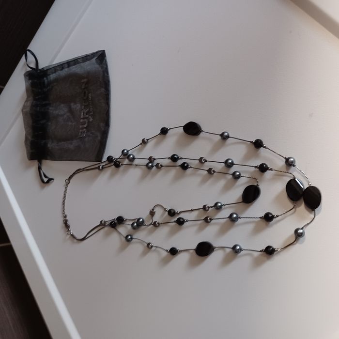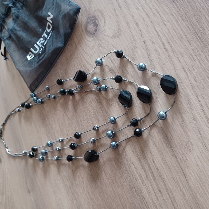 Collier 3 rangs gris-noir-argenté Burton très bon état grosses perles noires petites perles grises le reste argenté longueur du plus grand à plat 35 cm au maximum avec un réglage + ou - 4cm petite pochette noire pour le rangement
