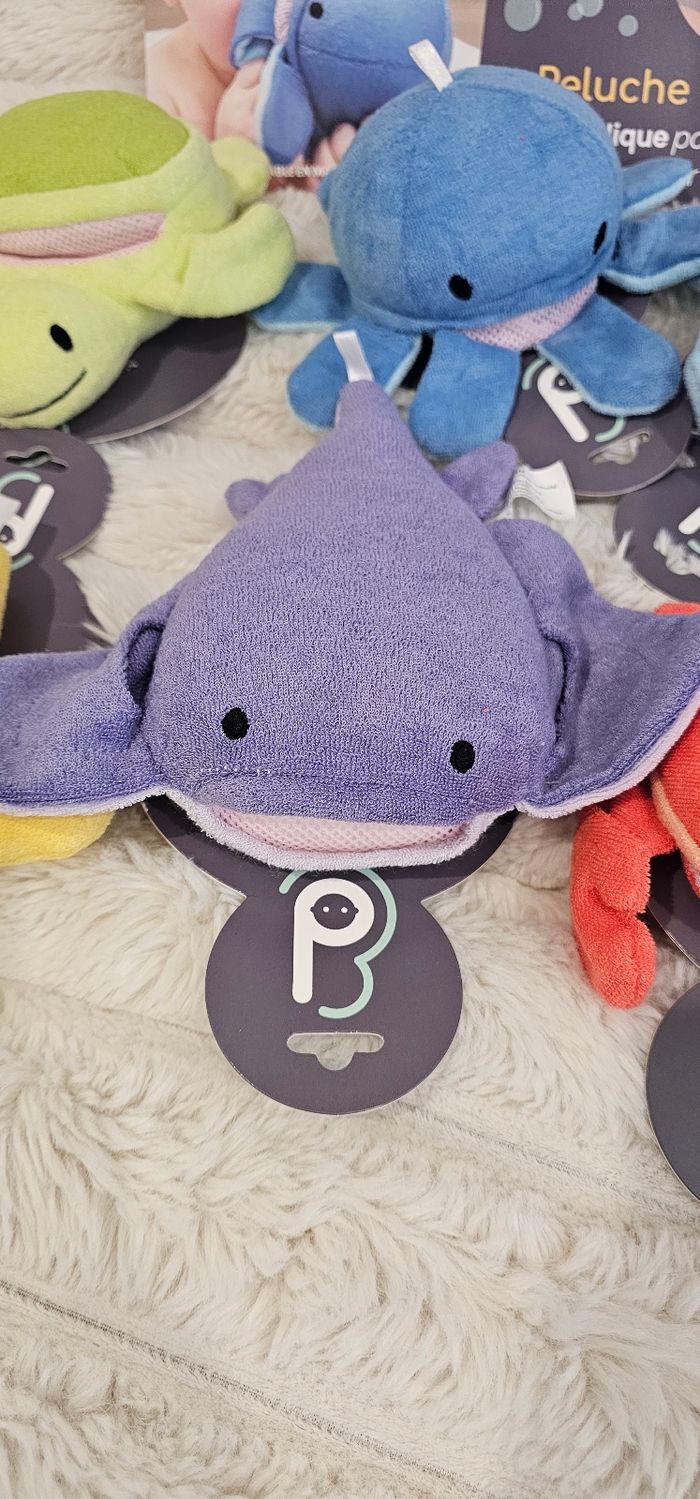 Lot de 6 peluches de bain sur le thème des animaux de la mer. Bébé peut jouer avec et peut également servir de gant de toilette. Lavage en machine. Neufs.
