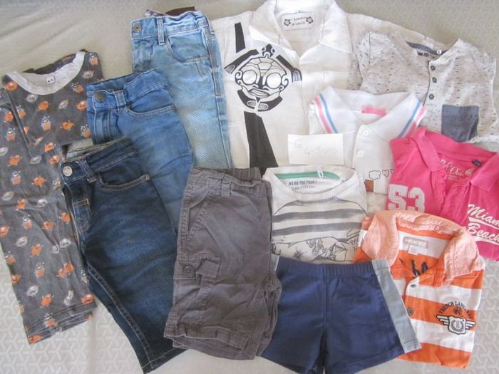 4/5 ans, chemise mc + haut ml + 2 polos (1 offert car tâche) + haut mc + short bain + short + 3 pantacourts + pyjama 2 pièces, l'homme de tahiti, pic ouic, orchestra
