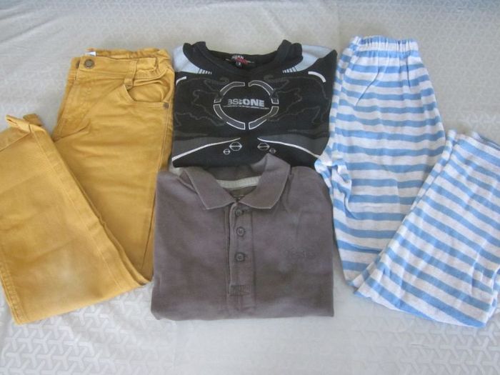 8 ans, bas velours + polo + haut ml + jean (blanchi aux genoux), fashion wear, domyos, gemo