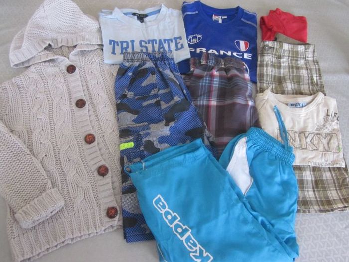 10 ans, veste/gilet à capuche + 3 hauts mc + haut ml + 3 pantacourts/bermudas + 4ème offert (le kappa, état satisfaisant), nky, vitamines, h&m
