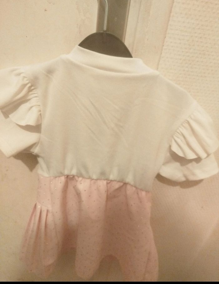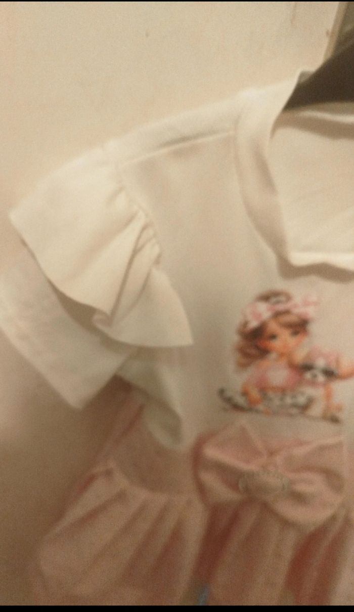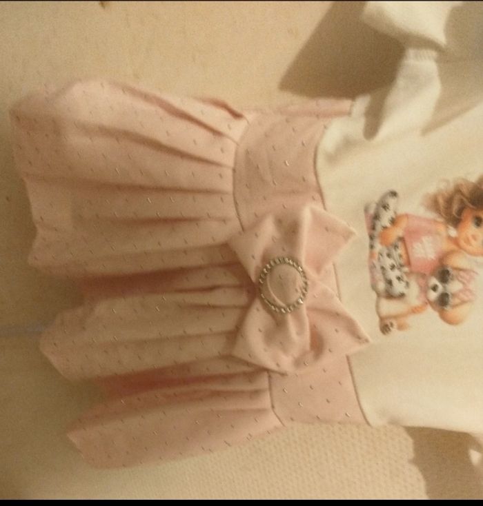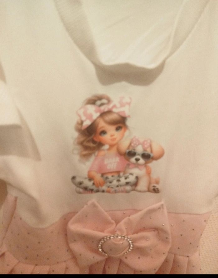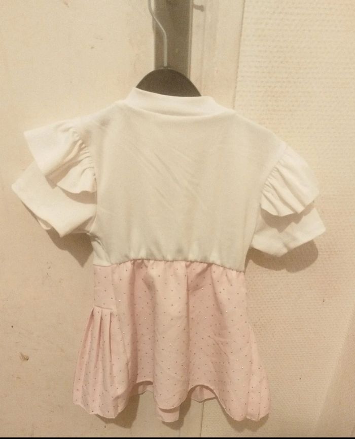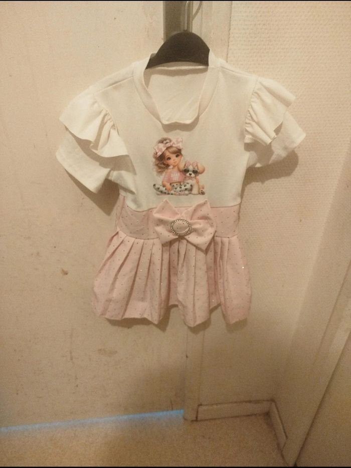 Robe en très bon état taille 18 mois le côté rose il y a des petits paillettes vous voyez bien sur les photos que c'est bien pailleté pour le dessin il y a une petite fille avec un chien elle m'a coûté 15,99 € je la mets à 5 €en sachant qu'elle est en très très bon état elle l'a porté que deux fois mais pas pour longtemps juste pour des occasions pour des photos