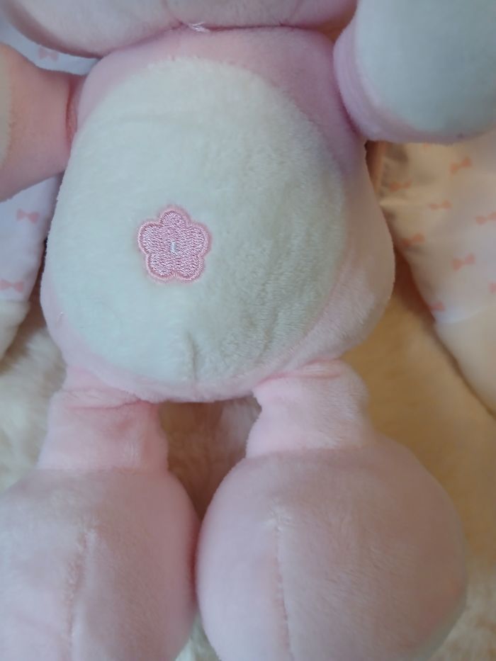 Doudou-Peluche entièrement rembourré; yeux et museau brodés; grandes oreilles doublées de tissu imprimé "Petits noeuds"; papier bruissant au bout des oreilles; fleur 🌸 brodée sur le ventre. Hauteur totale de 26 cm; lavable à 39° // voir photos pour détails. À Noter : étiquette coupée