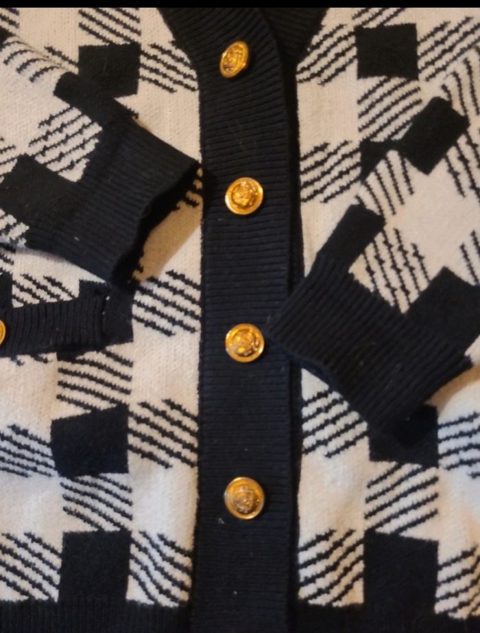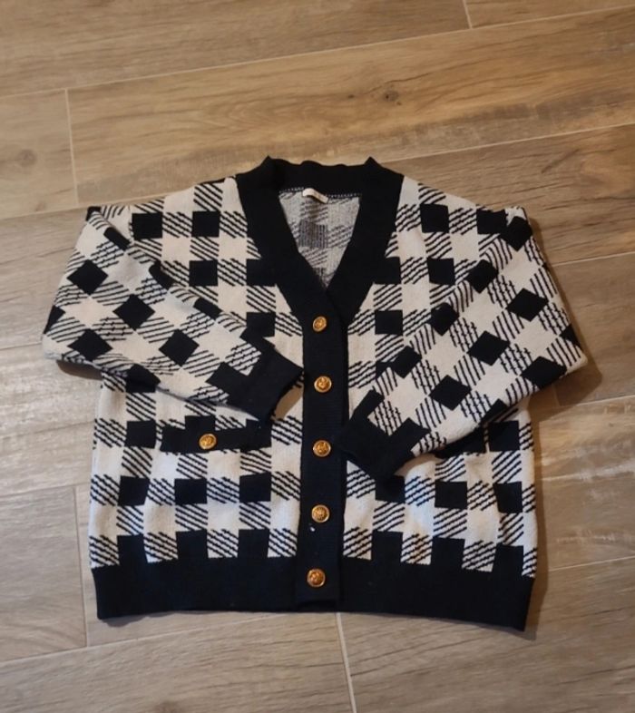 À vendre ce magnifique cardigan Lili & Lolo en excellent état, parfait pour ajouter une touche d’élégance à vos tenues ! Motif : Noir et blanc à carreaux avec des détails géométriques. Détails : Boutons dorés qui apportent une touche de luxe. Matière : Douce et confortable, idéale pour les saisons intermédiaires. Marque : Lili & Lolo, connue pour ses pièces intemporelles et de qualité.