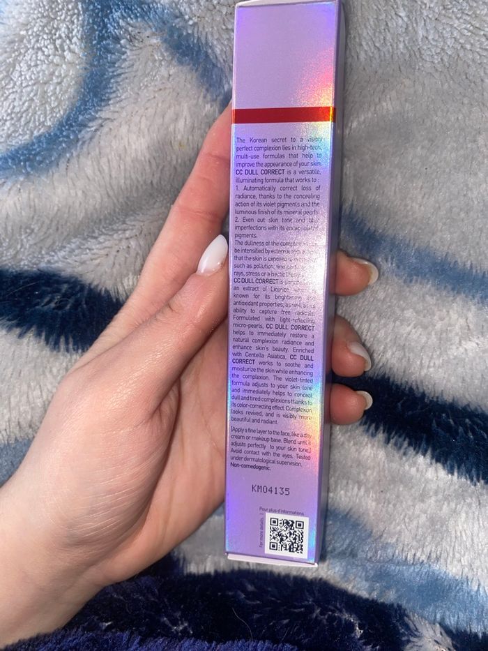 Description : Prix magasin : 45,50€, état : NEUF CC DULL CORRECT est un traitement éclaircissant multiple qui aide à : 1) corriger automatiquement la perte d'éclat, grâce à l'action camouflante des pigments violets et au fini éclatant des perles minérales. 2) d'unifier le teint et d'estomper les imperfections, grâce aux pigments encapsulés. L'apparence d'un teint terne peut s'intensifier, en raison des agressions extérieures que la peau subit quotidiennement, comme la pollution, les particules fines, le soleil, le stress ou un rythme de vie intense. CC DULL CORRECT est enrichi en extrait de réglisse, connu pour ses propriétés éclaircissantes et antioxydantes et pour sa capacité à piéger les radicaux libres. Formulé avec des microbilles réflectrices de lumière, CC DULL CORRECT aide à restaurer instantanément votre éclat naturel et à illuminer votre teint. Enrichi en Centella Asiatica, CC DULL CORRECT aide à apaiser et à hydrater la peau, tout en améliorant le teint. La formule violette s'adapte au teint et permet de camoufler instantanément un teint terne ou fatigué, grâce à son effet correcteur de couleur. Le teint est rafraîchi, votre peau devient visiblement plus belle et plus lumineuse.