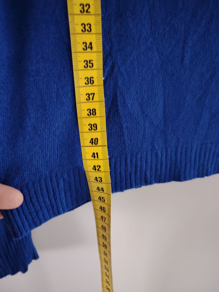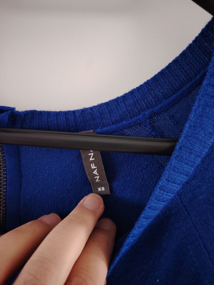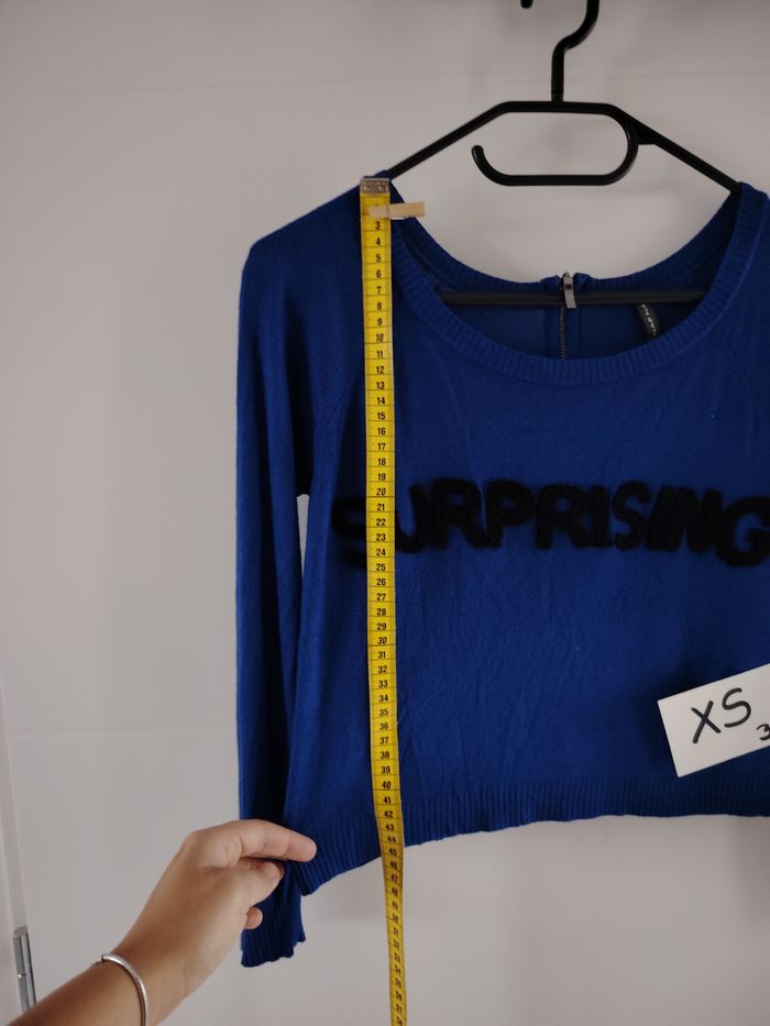 Pull court bleu électrique de la marque Naf Naf, taille XS. Coupe courte et moderne, manches longues, col rond. 📏 Mesures : Longueur : environ 46–47 cm (voir photos avec mètre) ✨ État : très bon état 👕 Couleur : bleu vif 🏷 Taille : XS