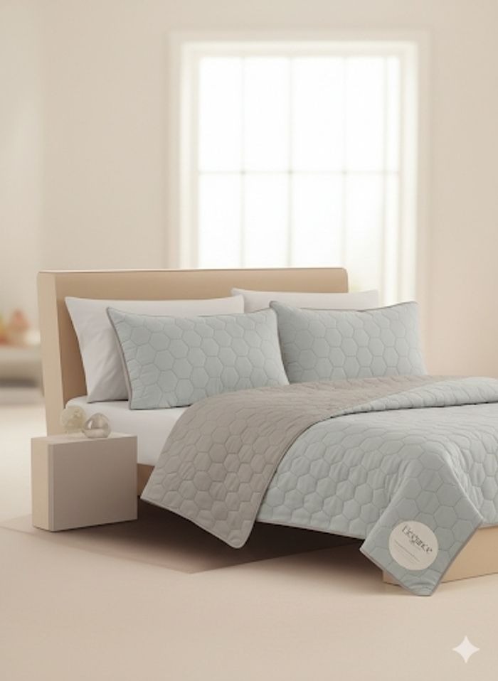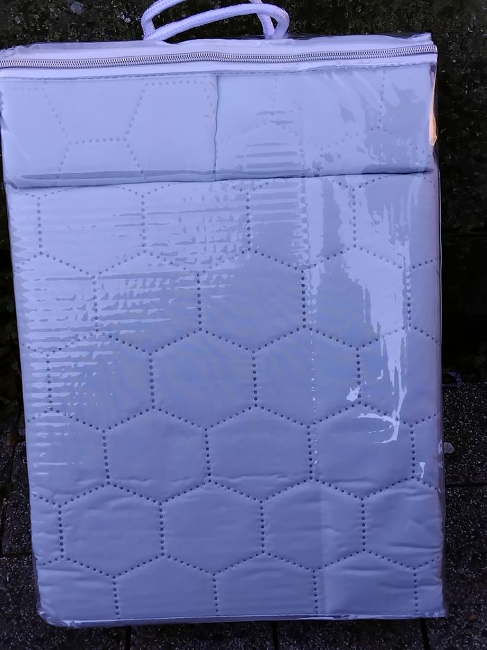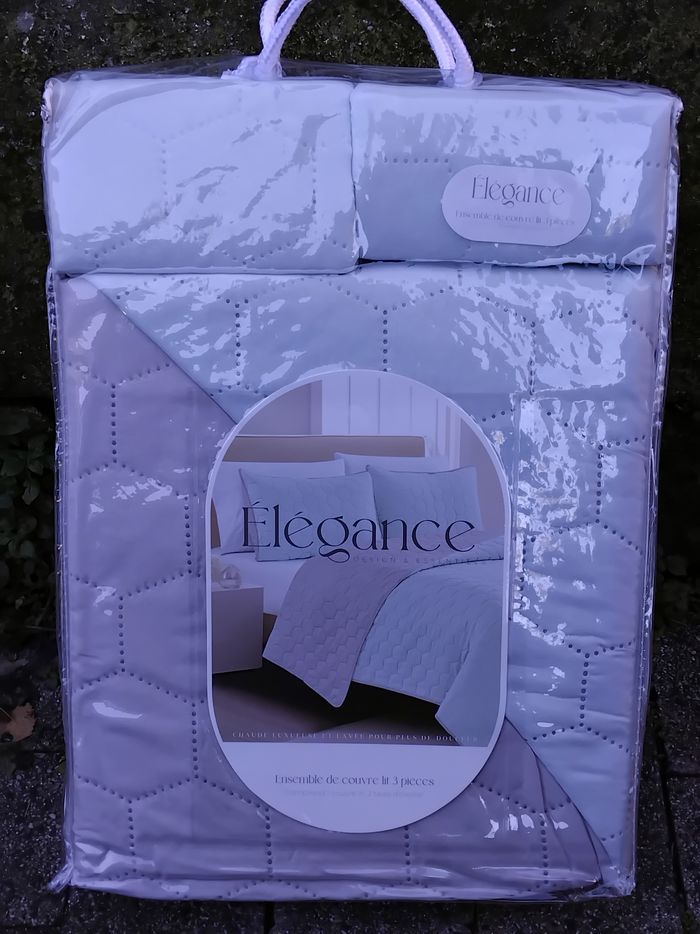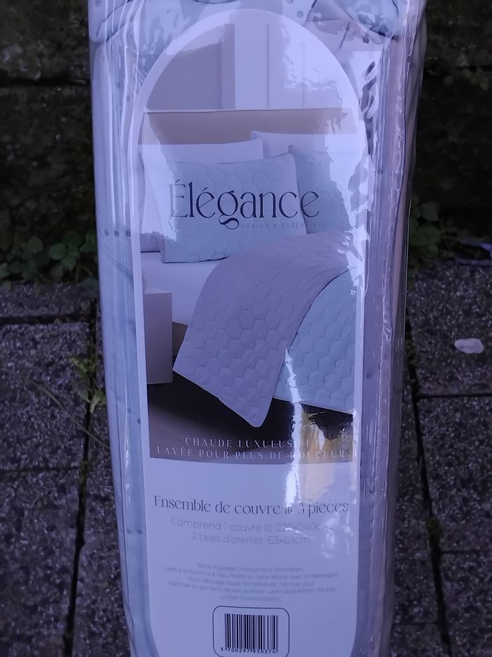 ​Je vends cet ensemble de couvre-lit de la marque Élégance, totalement neuf dans son emballage d'origine. Avec son motif géométrique en nid d'abeille (hexagones), il apporte une touche contemporaine et cocooning à n'importe quelle décoration. ​📋 Caractéristiques du produit : ​Contenu : 3 pièces (1 couvre-lit + 2 taies d'oreiller assorties). ​Dimensions Couvre-lit : 220 \times 240 cm (Idéal pour un lit 2 personnes standard ou Queen Size). ​Dimensions Taies : 63 \times 63 cm. ​Matière : 100% Polyester (doux au toucher, chaud et luxueux). ​Couleur : Un magnifique gris bleuté/pastel très apaisant. ​Entretien : Lavable en machine à l'eau froide (cycle délicat). ​💰 Prix & État : ​État : Neuf sous blister, jamais déballé. ​Valeur magasin : 49,99 €.