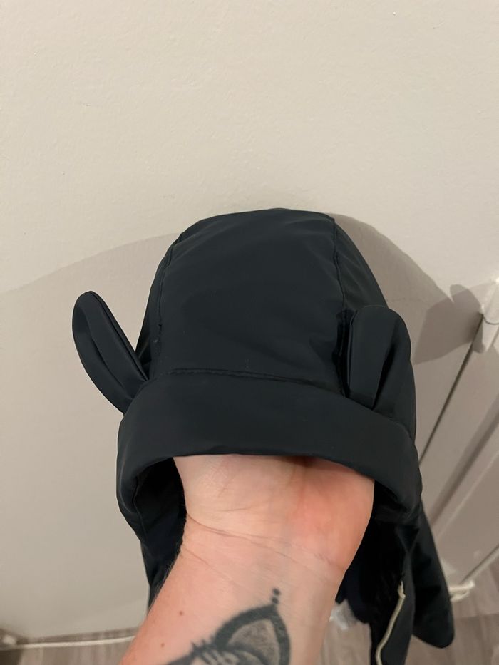 Parka bien chaud à l’intérieur et effet kaway a l’extérieur , quand il pleut c’est top , sa glisse dessus . Capuche molletonné également et un design sympa avec les petites oreille .