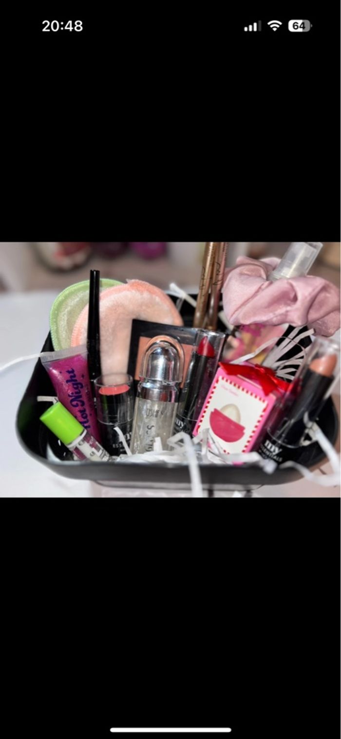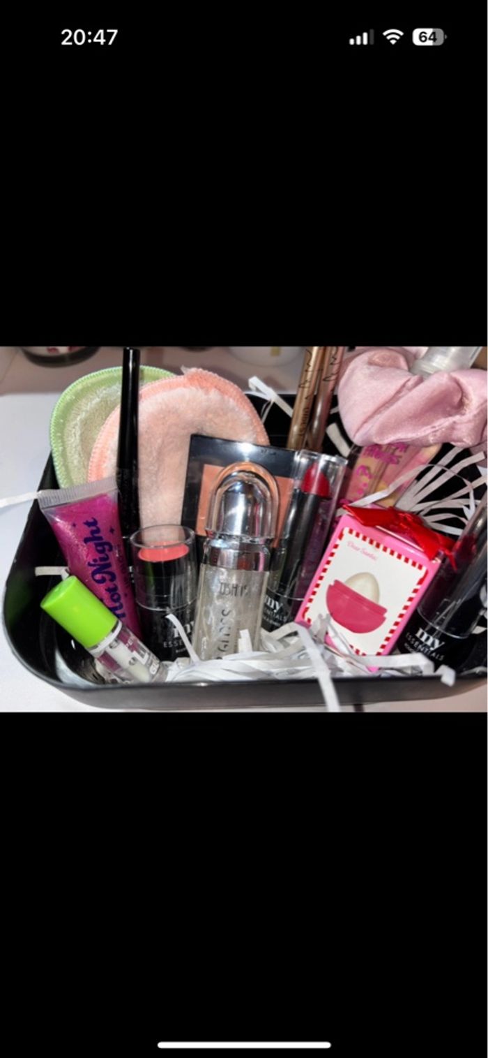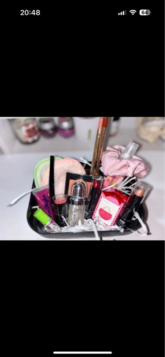 Petit coffret À l’intérieur il y a : -un Highlighter -eye-liner -un tout petit gloss -deux. Autres gloss. -une brune -de rouge à lèvres, un rouge et un couleur mate -deux. Éponges, démaquillantes. -Deux. Crayons à lèvres, couleur mate. -un fard à joue rose en stick -un petit porte clé avec des fleurs -une palette avec deux type de fard à joue de deux couleurs différentes