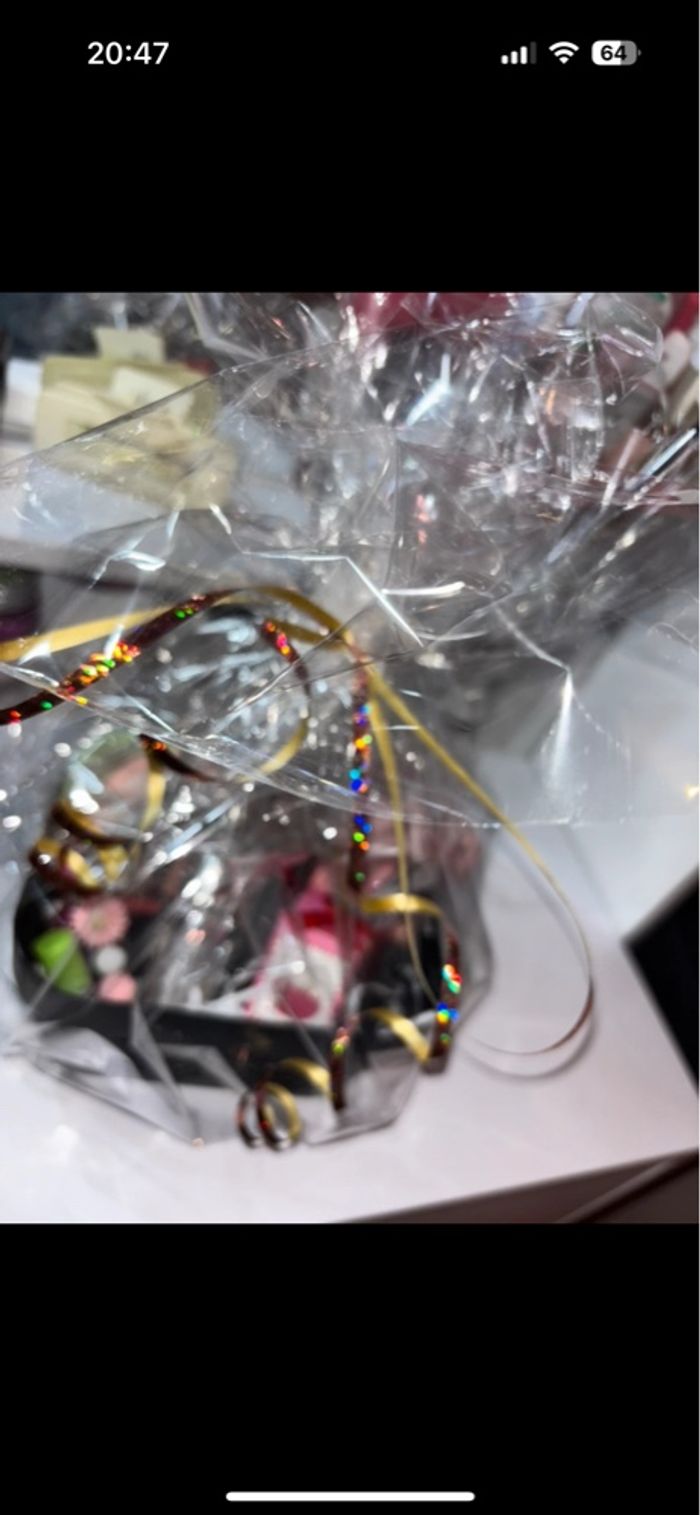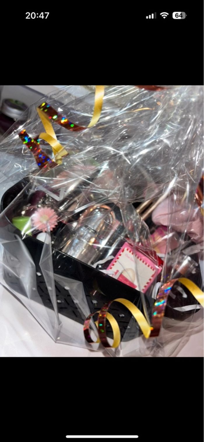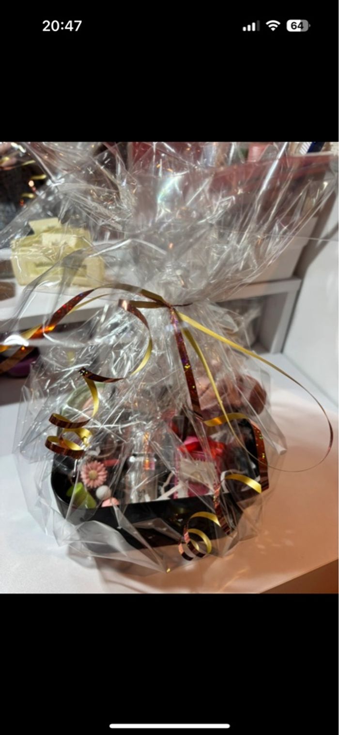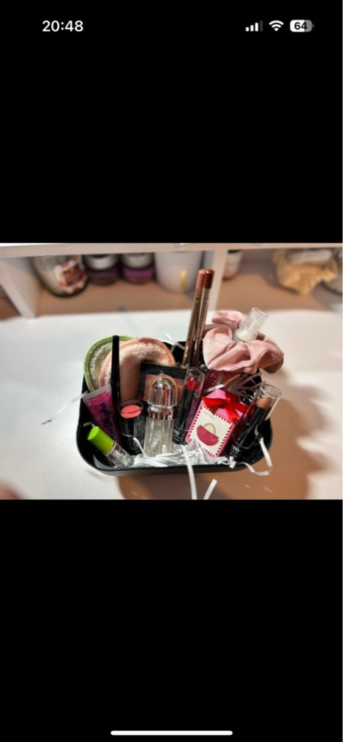 Petit coffret À l’intérieur il y a : -un Highlighter -eye-liner -un tout petit gloss -deux. Autres gloss. -une brune -de rouge à lèvres, un rouge et un couleur mate -deux. Éponges, démaquillantes. -Deux. Crayons à lèvres, couleur mate. -un fard à joue rose en stick -un petit porte clé avec des fleurs -une palette avec deux type de fard à joue de deux couleurs différentes