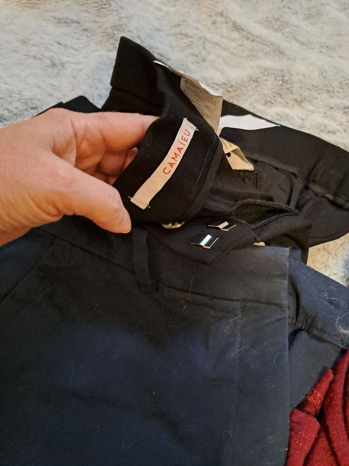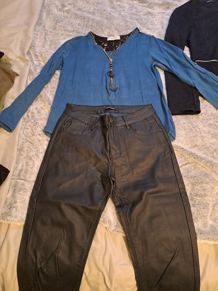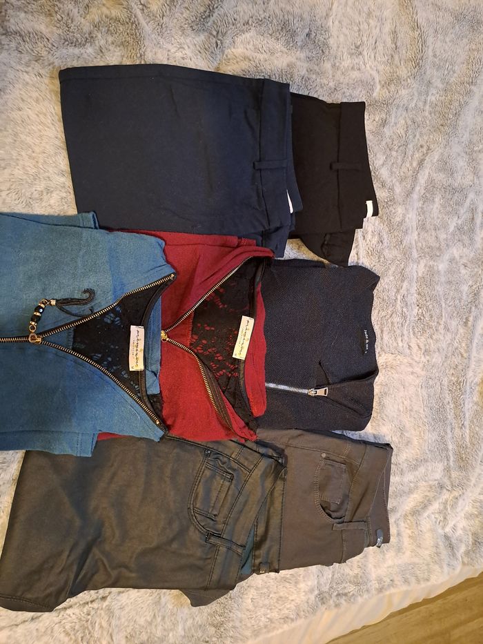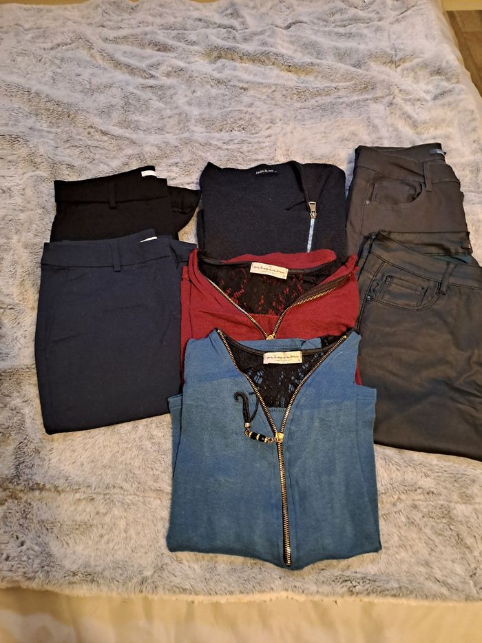 Lot de 7 vêtements Taille M 1 veste bleu marine 4 pantalons dont 2 Camaïeu et 2 autres simili 2 pulls mi saison En tres bon etat 1 cadeau offert si achat 12 euros le tout