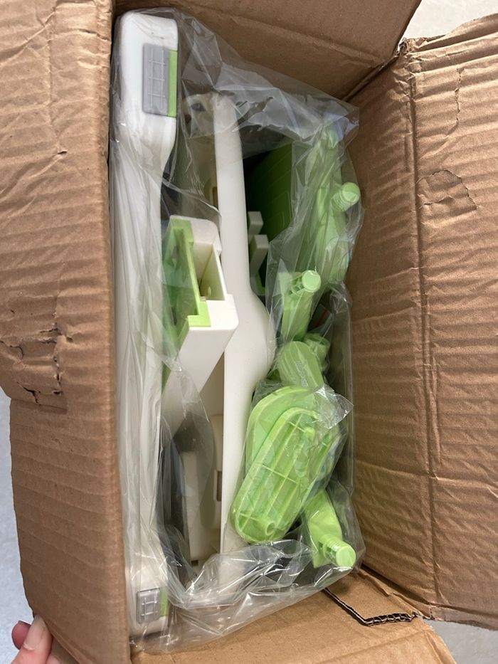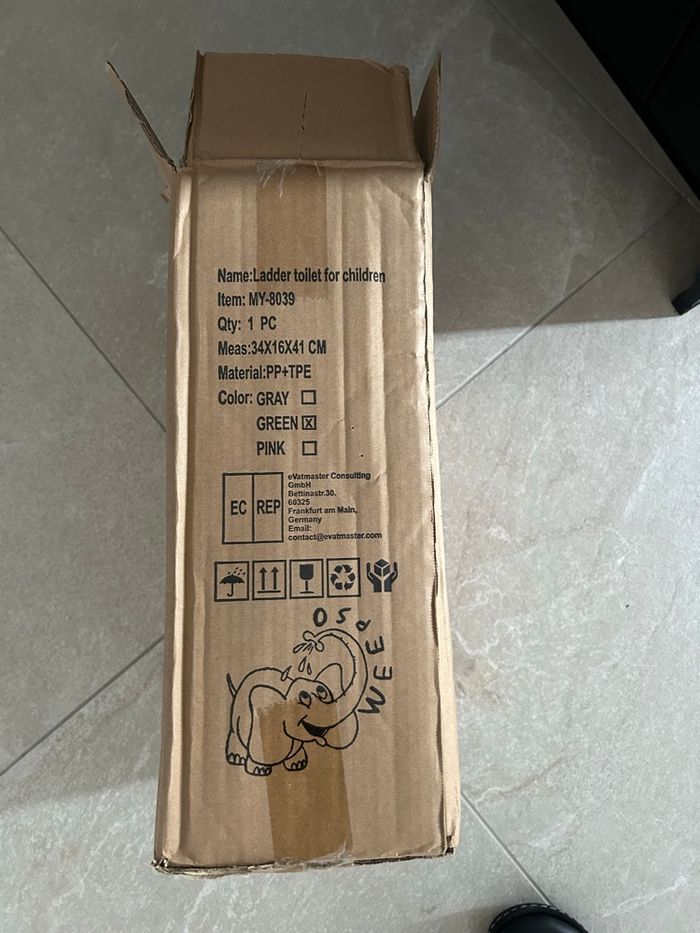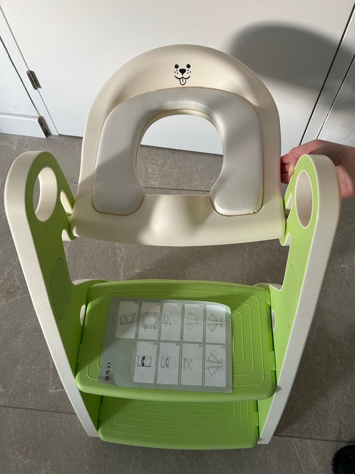 Réducteur de toilettes pour enfant avec échelle, neuf, jamais utilisé, encore dans son carton d'origine. Compatible avec la plupart des WC Échelle antidérapante, sécurisée Assise confortable Facile à installer J Couleur : vert / blanc Idéal pour l'apprentissage de la propreté.