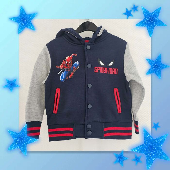 Veste à capuche Spider-Man neuve, jamais portée. Coloris bleu marine avec manche grise, fermeture par boutons pression. Impression Spider-Man sur le devant. Taille : 3,4,6 et 8 ans Caractéristiques : État : neuf Capuche intégrée Deux poches avant Matière confortable Finitions soignées Envoi rapide Disponible pour toute information complémentaire.