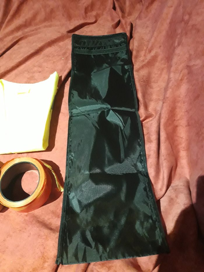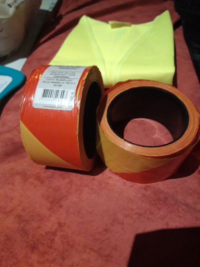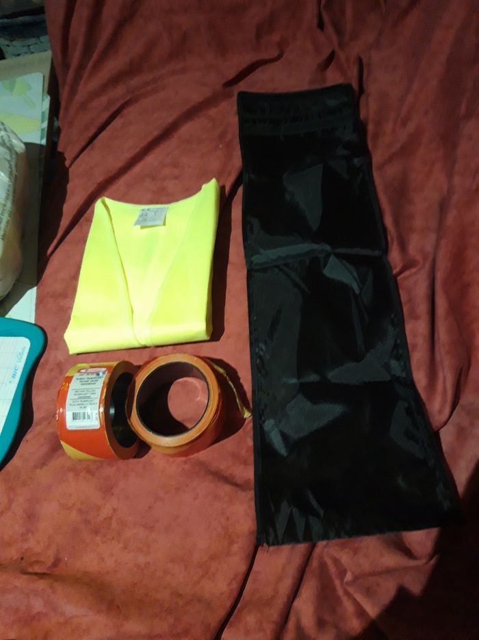 Lot composé d un gilet jaune, d une petite housse noir et de 2 rouleaux de rubans jaune et rouge (dont 1 neuf) Bon état 1 € le tout (Caisse DIM)