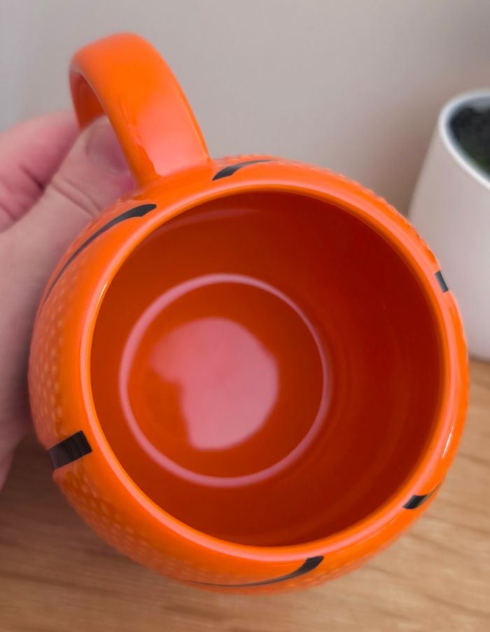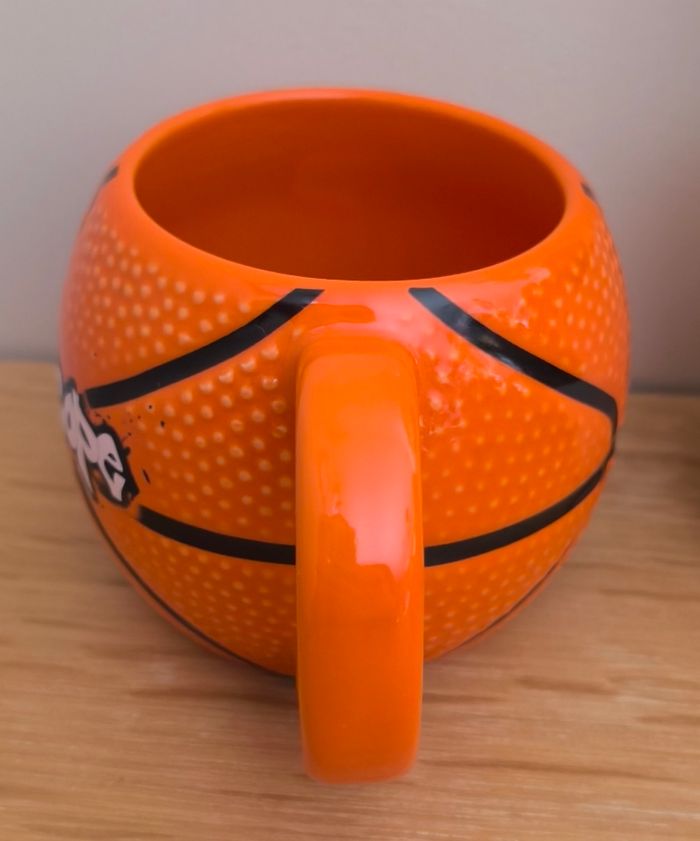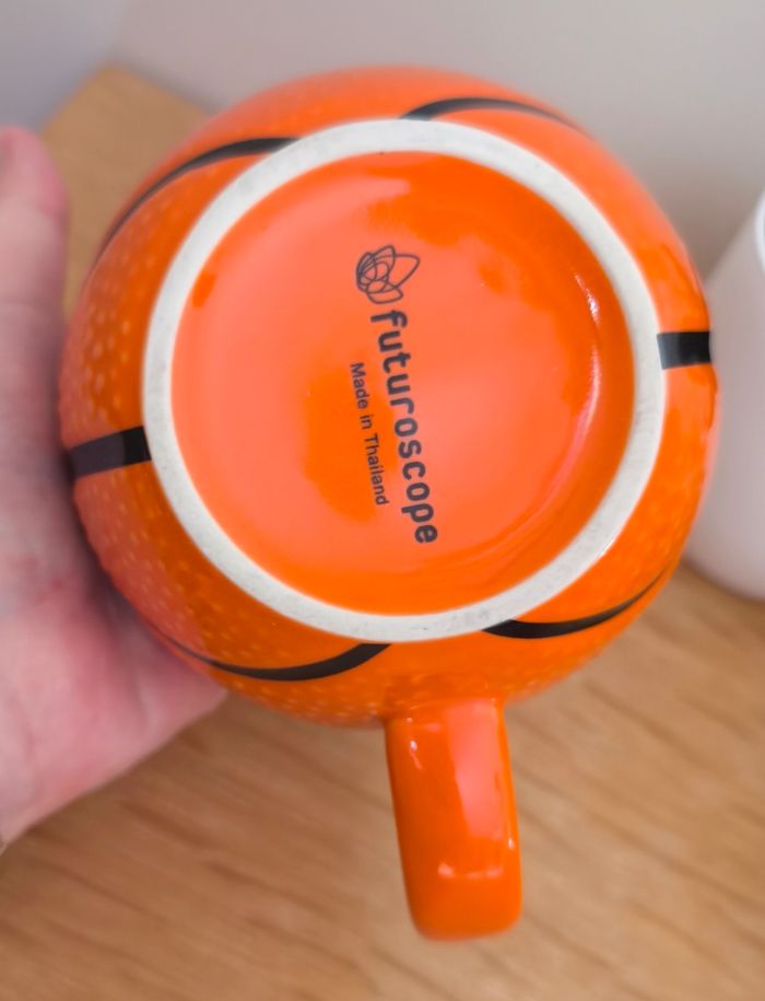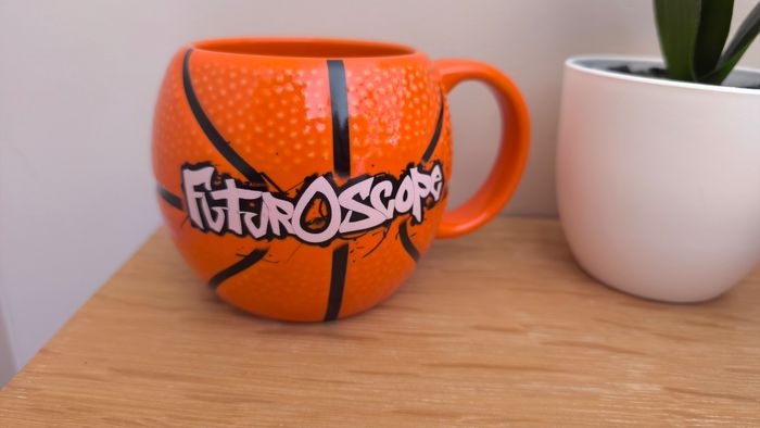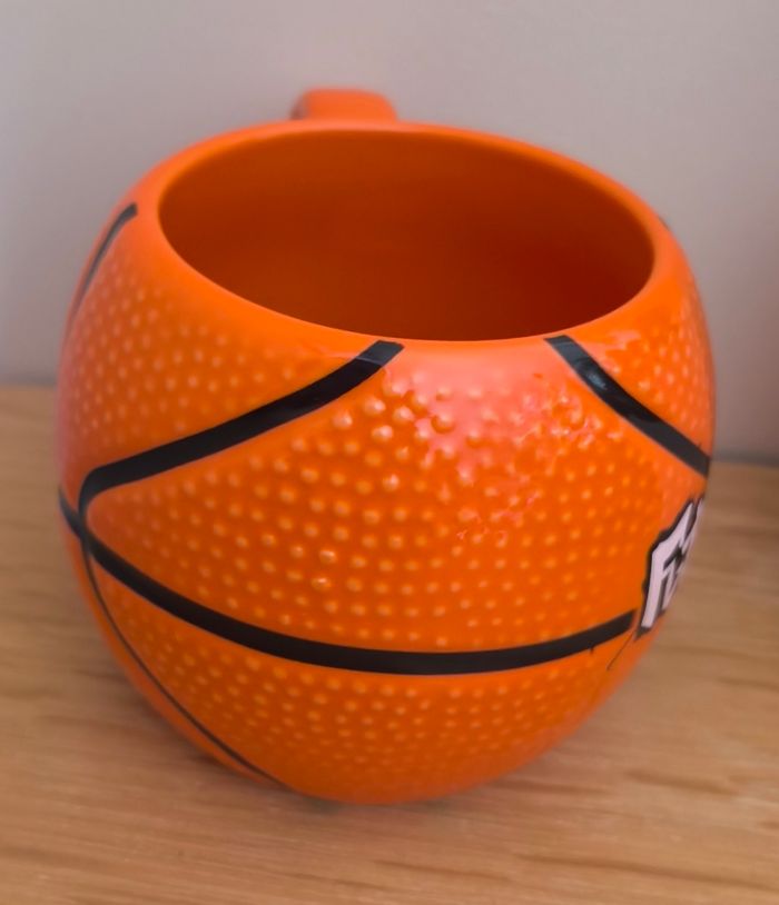 Mug Futuroscope - Orange - Forme ballon de basket - En céramique - Dimensions : H 9 cm x D 8,5 cm - 10 cm au plus grand ℹ️ Neuve, restée en décoration dans une vitrine ⚠️ Les points blancs sont des reflets avec la lumière #kat02600maison #futuroscope #mugfuturoscope #mugballondebasket #tasseballondebasket #tassefuturoscope