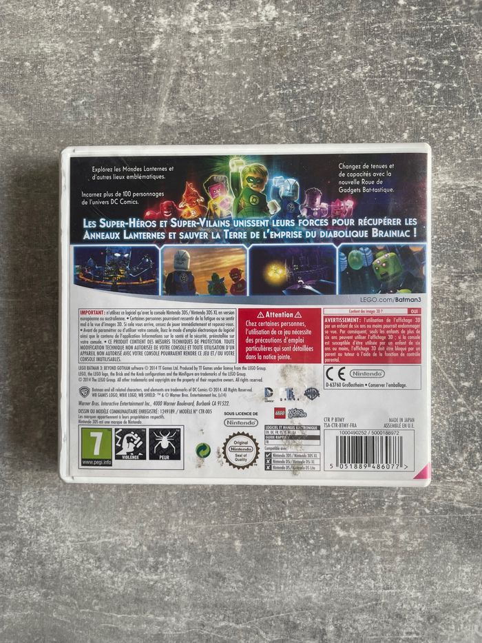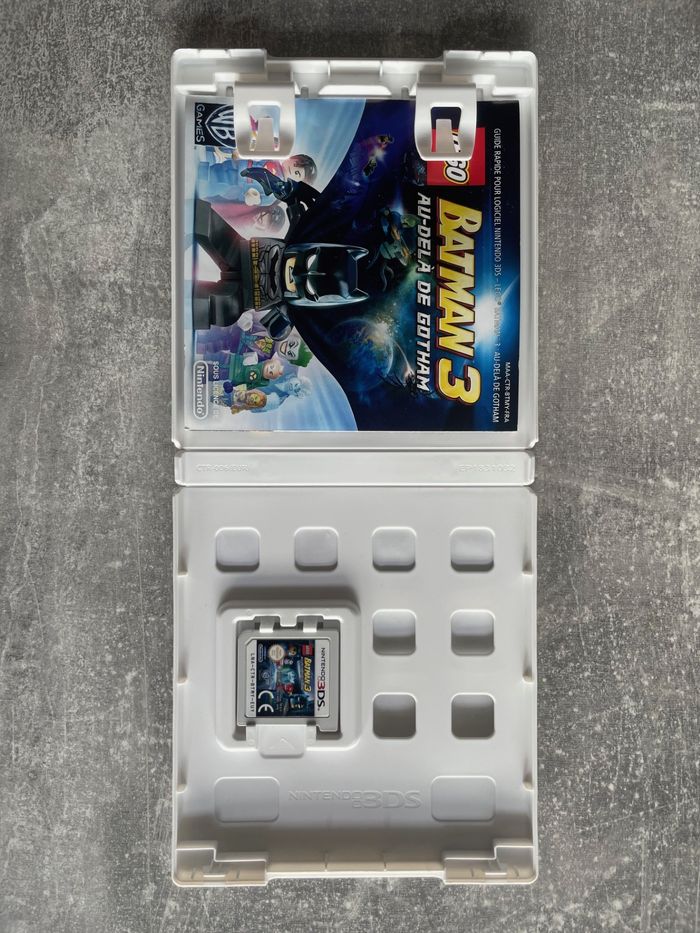 Jeu pour Nintendo 3DS, Lego batman 3, au-delà de Gotham en français. Bon état. Complet avec sa boite et son guide rapide ( manuel non présent car manuel électronique pour ce jeu, voir dos de la boite ). Langues disponibles ( Logiciel et manuel électronique ) : Français, anglais, allemand, espagnol, danois, hollandais et italien. Langue disponible pour le guide rapide : Français. Compatible avec : New Nintendo 3DS, New Nintendo 3DS XL, Nintendo 3DS, 3DS XL, 2DS. Non compatible avec : Nintendo DS, DS lite, DSi, DSi XL. Envoi rapide et soigné. Consultez mes autres articles pour de moindres frais de port.