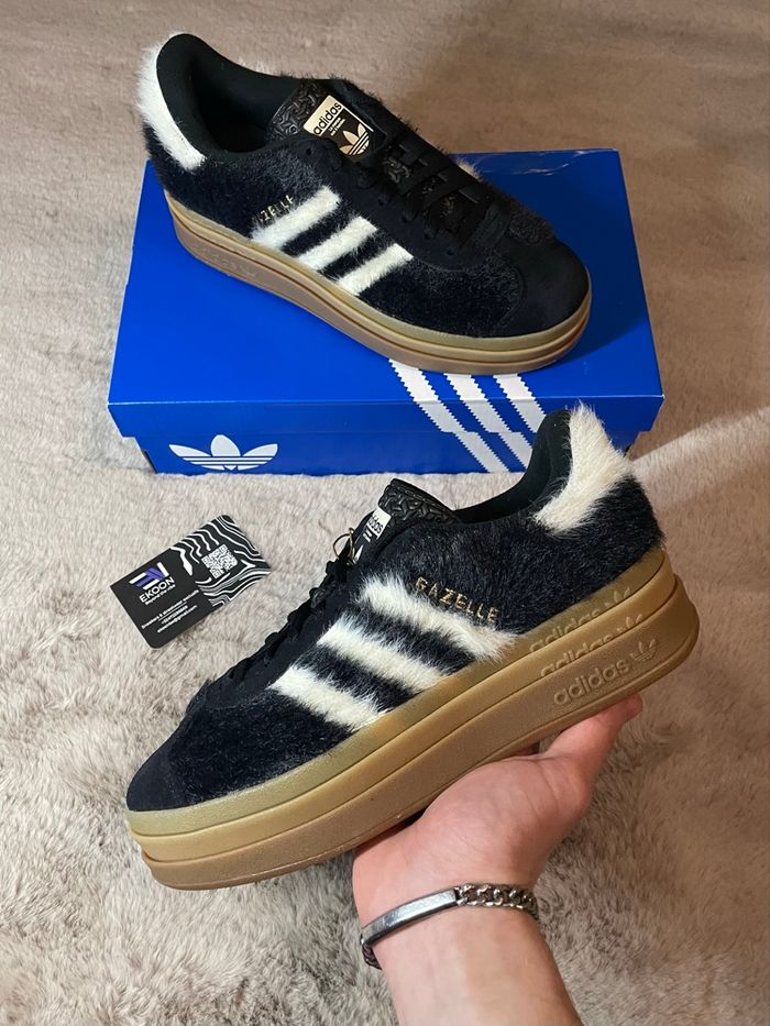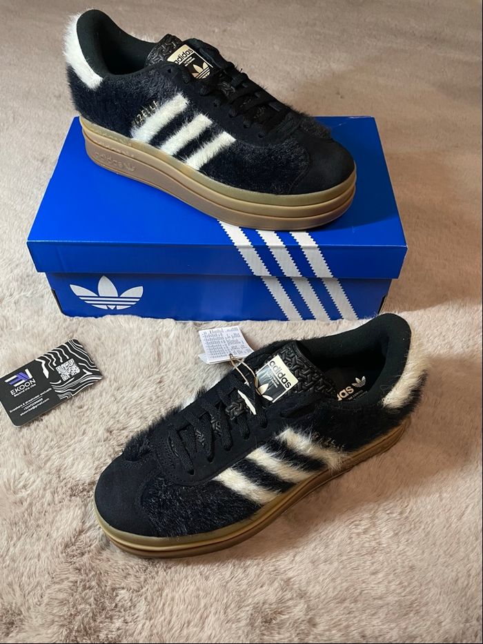 Adidas Originals Gazelle Bold W – Core Black Cream White Metallic Gold 📏 Taille : EU – 39 1/3 / US – 7.5 / UK – 6 🎨 Coloris : Core Black / Cream White / Metallic Gold 🔖 SKU : JS3907 📦 État : Neuves avec étiquettes 🚚 Livraison : Sous 48h 💶 Prix : Négociable dans la limite du raisonnable La Gazelle Bold revisite le modèle iconique Adidas avec une semelle plateforme audacieuse et un design résolument moderne ✨ Son suède noir profond, associé aux bandes crème et aux détails dorés métallisés, apporte une touche élégante et premium à cette silhouette rétro. Un parfait équilibre entre style affirmé, confort et tendance actuelle. ✔️ Silhouette Gazelle iconique version Bold ✔️ Semelle plateforme moderne & stable ✔️ Détails dorés élégants et finitions premium