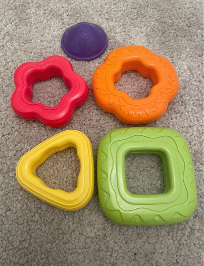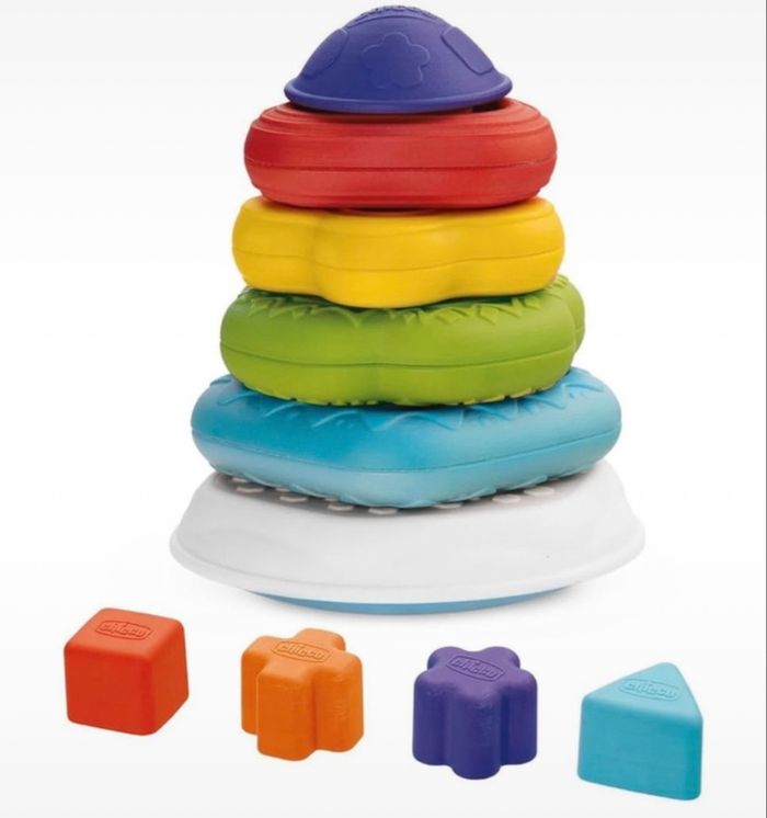 Anneaux à empilé 2 en 1 pour enfant 6-36 mois. De la marque Chicco. > 4 anneaux et un capuchon à empiler sur une base à bascule > 4 formes à insérer dans les anneaux