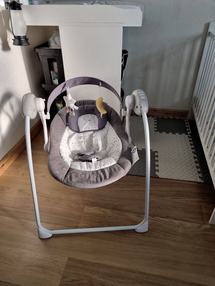 Je vends Balancelle Badabulle électrique. Fonctionne parfaitement. très propre. utilisée occasionnellement. exclusif!!🤩👍 je fournis également un autre ensemble rehange de : 1 assise tissus fauteuil, 1 arche et peluches et 1 prise secteur. - Type de produit : transat électrique dès la naissance jusqu'a 9kgs - Marque : Badabulle - Couleur : Gris / Anthracite - Fonctionnalités : -Balancelle électrique ( piles et/ou prise secteur) avec jouets d'éveil. -programmable,minuterie -5 vitesses -12 musiques a volume réglable