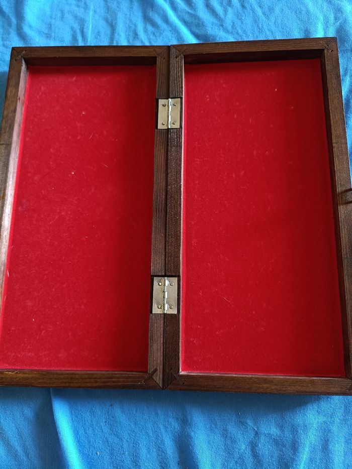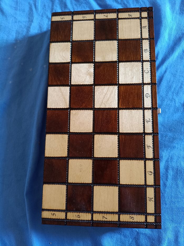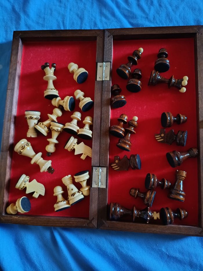 Je vends un jeu d’échecs en bois avec échiquier pliant et rangement intégré. 🔹 Pièces en bois clair et foncé 🔹 Jeu complet (aucune pièce manquante)