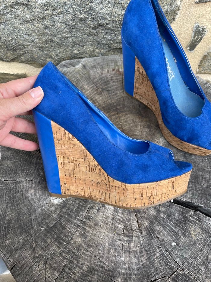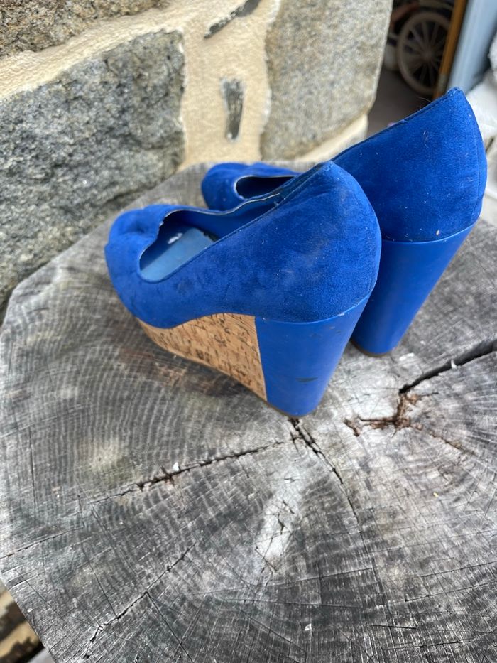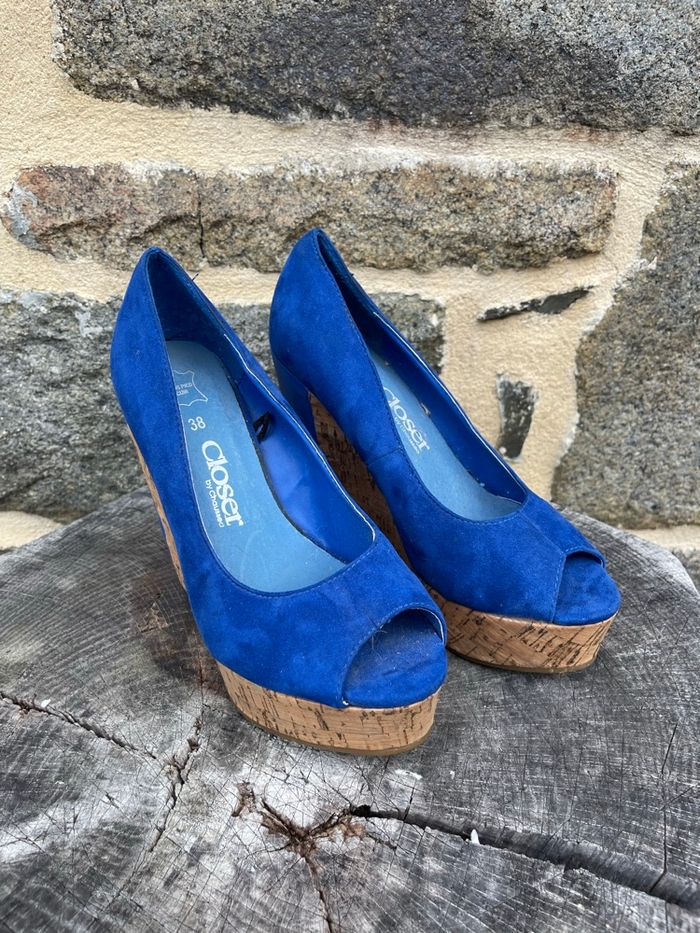 Compensée à talon en liège Dessus en velours bleu électrique Taille 38 Talon 12,5cm et plate-forme 3cm Très bonne état Closer - Chaussea